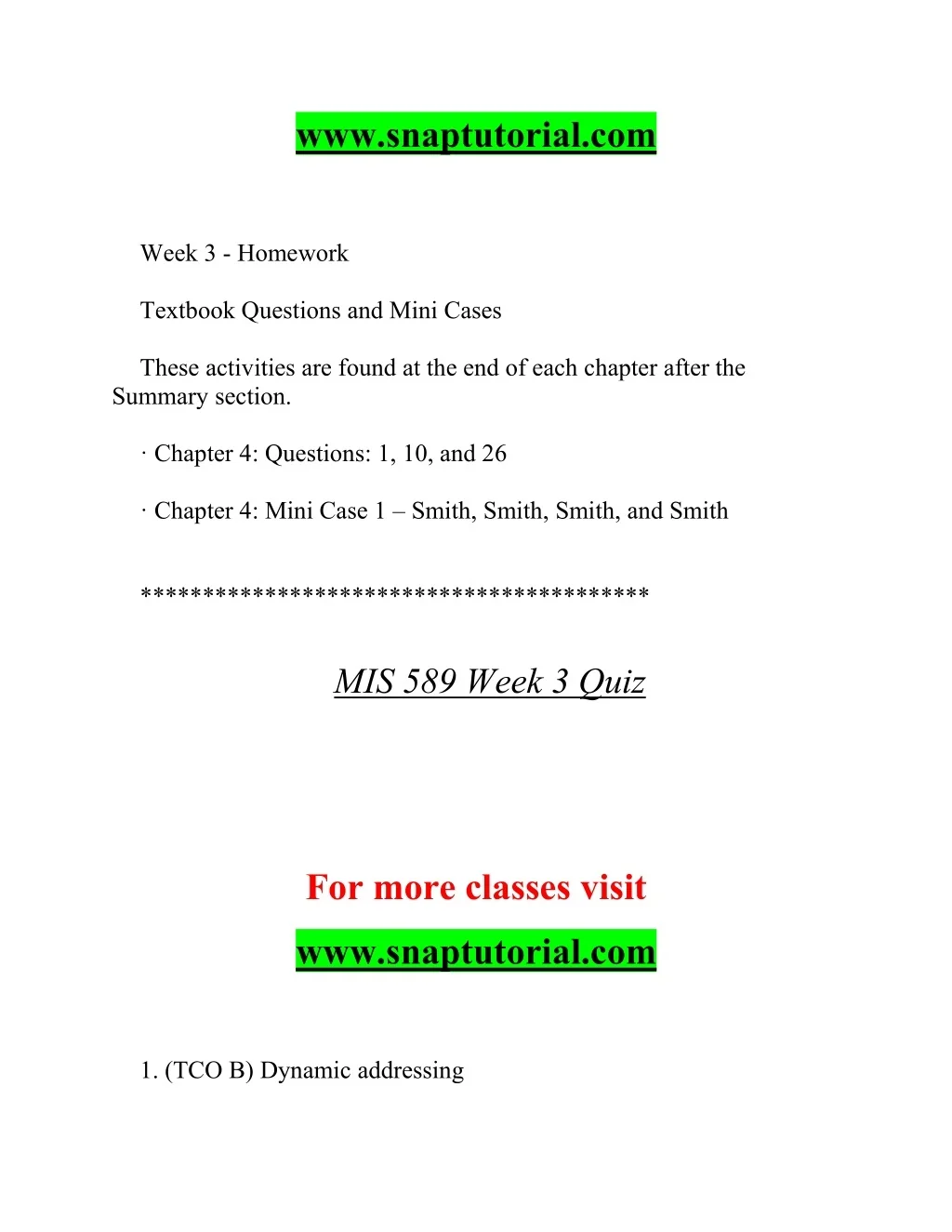 www.snaptutorial.com Week 3 - Homework Textbook Questions and Mini Cases These activities are found at the end of each chapter after the Summary section. · Chapter 4: Questions: 1, 10, and 26 · Chapter 4: Mini Case 1 – Smith, Smith, Smith, and Smith ***************************************** MIS 589 Week 3 Quiz For more classes visit www.snaptutorial.com 1. (TCO B) Dynamic addressing