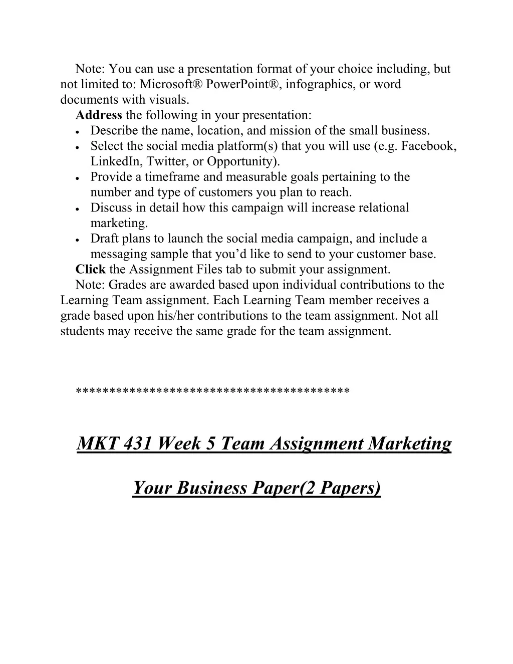 Note: You can use a presentation format of your choice including, but not limited to: Microsoft® PowerPoint®, infographics, or word documents with visuals. Address the following in your presentation: Describe the name, location, and mission of the small business. Select the social media platform(s) that you will use (e.g. Facebook, LinkedIn, Twitter, or Opportunity). Provide a timeframe and measurable goals pertaining to the number and type of customers you plan to reach. Discuss in detail how this campaign will increase relational marketing. Draft plans to launch the social media campaign, and include a messaging sample that you’d like to send to your customer base. Click the Assignment Files tab to submit your assignment. Note: Grades are awarded based upon individual contributions to the Learning Team assignment. Each Learning Team member receives a grade based upon his/her contributions to the team assignment. Not all students may receive the same grade for the team assignment. ***************************************** MKT 431 Week 5 Team Assignment Marketing Your Business Paper(2 Papers)