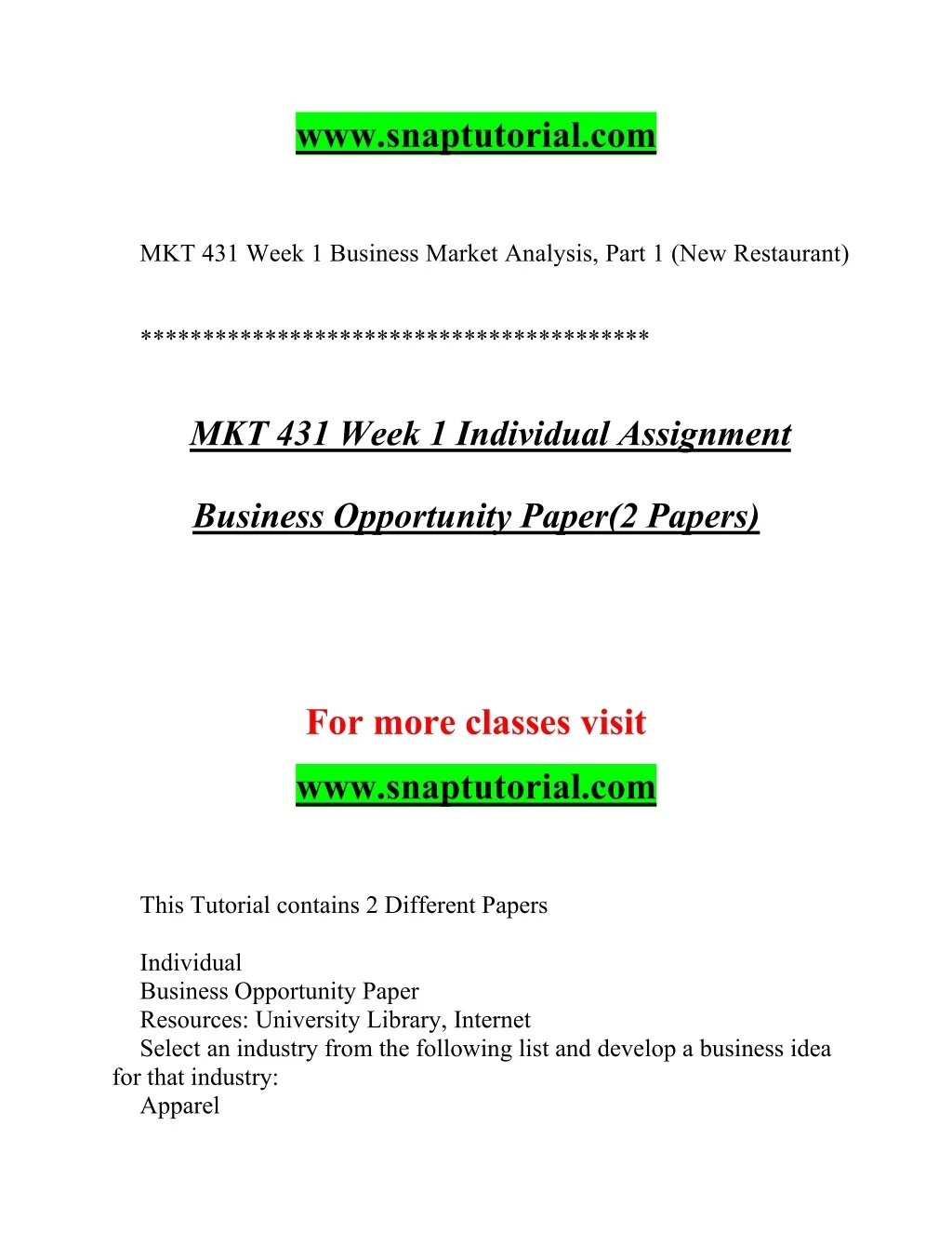 www.snaptutorial.com MKT 431 Week 1 Business Market Analysis, Part 1 (New Restaurant) ***************************************** MKT 431 Week 1 Individual Assignment Business Opportunity Paper(2 Papers) For more classes visit www.snaptutorial.com This Tutorial contains 2 Different Papers Individual Business Opportunity Paper Resources: University Library, Internet Select an industry from the following list and develop a business idea for that industry: Apparel