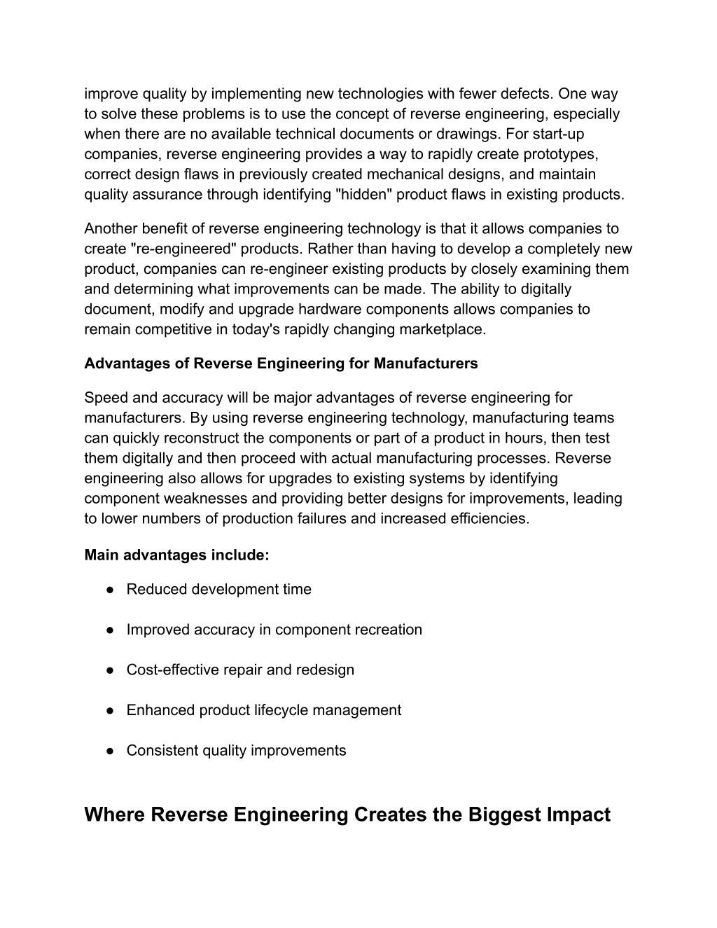 3. improve quality by implementing new technologies with fewer defects. One way to solve these problems is to use the concept of reverse engineering, especially when there are no available technical documents or drawings. For start-up companies, reverse engineering provides a way to rapidly create prototypes, correct design flaws in previously created mechanical designs, and maintain quality assurance through identifying "hidden" product flaws in existing products. Another benefit of reverse engineering technology is that it allows companies to create "re-engineered" products. Rather than having to develop a completely new product, companies can re-engineer existing products by closely examining them and determining what improvements can be made. The ability to digitally document, modify and upgrade hardware components allows companies to remain competitive in today's rapidly changing marketplace. Advantages of Reverse Engineering for Manufacturers Speed and accuracy will be major advantages of reverse engineering for manufacturers. By using reverse engineering technology, manufacturing teams can quickly reconstruct the components or part of a product in hours, then test them digitally and then proceed with actual manufacturing processes. Reverse engineering also allows for upgrades to existing systems by identifying component weaknesses and providing better designs for improvements, leading to lower numbers of production failures and increased efficiencies. Main advantages include: ● Reduced development time ● Improved accuracy in component recreation ● Cost-effective repair and redesign ● Enhanced product lifecycle management ● Consistent quality improvements Where Reverse Engineering Creates the Biggest Impact
