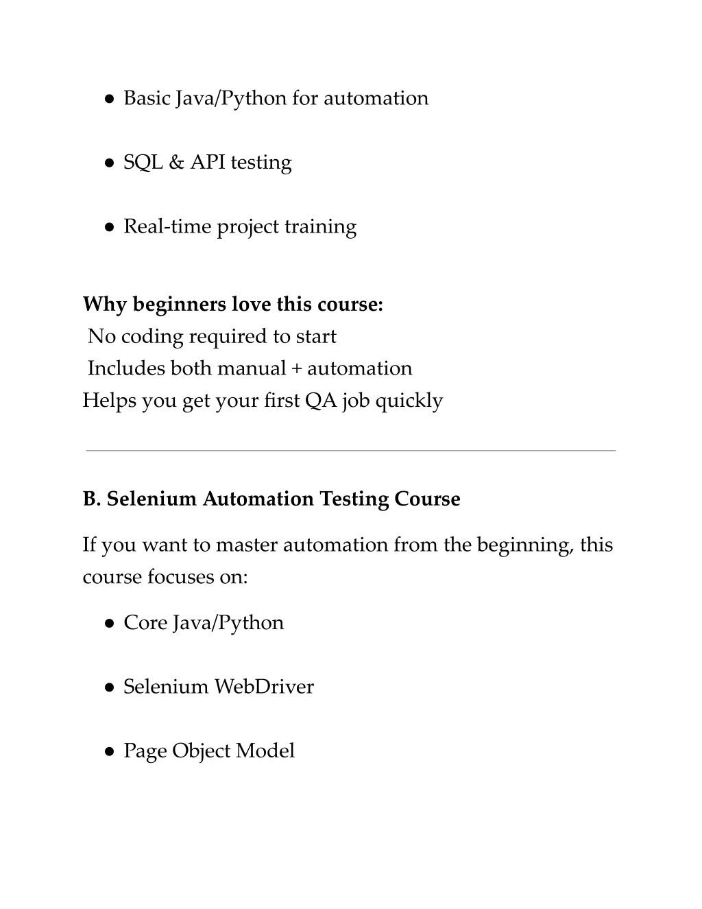 7. ● Basic Java/Python for automation ● SQL & API testing ● Real-time project training Why beginners love this course: No coding required to start Includes both manual + automation Helps you get your first QA job quickly B. Selenium Automation Testing Course If you want to master automation from the beginning, this course focuses on: ● Core Java/Python ● Selenium WebDriver ● Page Object Model