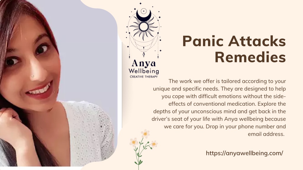 Panic Attacks Remedies The work we offer is tailored according to your unique and specific needs. They are designed to help you cope with difficult emotions without the side- effects of conventional medication. Explore the depths of your unconscious mind and get back in the driver’s seat of your life with Anya wellbeing because we care for you. Drop in your phone number and email address. https://anyawellbeing.com/