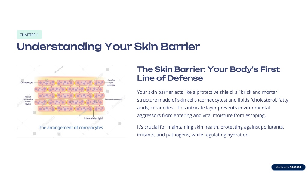 CHAPTER 1 Understanding Your Skin Barrier The Skin Barrier: Your Body's First Line of Defense Your skin barrier acts like a protective shield, a "brick and mortar" structure made of skin cells (corneocytes) and lipids (cholesterol, fatty acids, ceramides). This intricate layer prevents environmental aggressors from entering and vital moisture from escaping. It's crucial for maintaining skin health, protecting against pollutants, irritants, and pathogens, while regulating hydration.