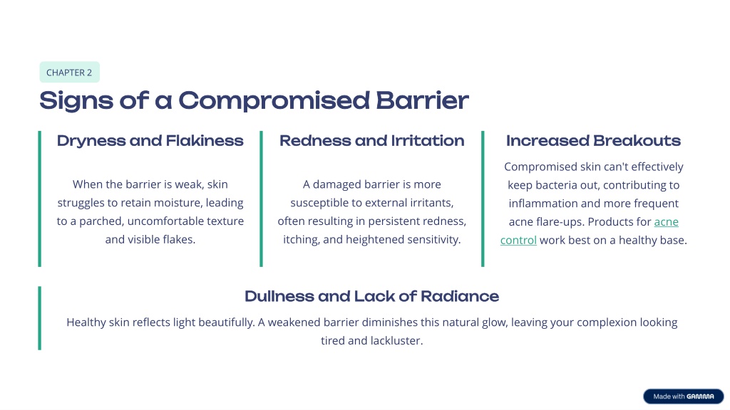 CHAPTER 2 Signs of a Compromised Barrier Dryness and Flakiness Redness and Irritation Increased Breakouts Compromised skin can't effectively keep bacteria out, contributing to inflammation and more frequent acne flare-ups. Products for acne control work best on a healthy base. When the barrier is weak, skin struggles to retain moisture, leading to a parched, uncomfortable texture and visible flakes. A damaged barrier is more susceptible to external irritants, often resulting in persistent redness, itching, and heightened sensitivity. Dullness and Lack of Radiance Healthy skin reflects light beautifully. A weakened barrier diminishes this natural glow, leaving your complexion looking tired and lackluster.