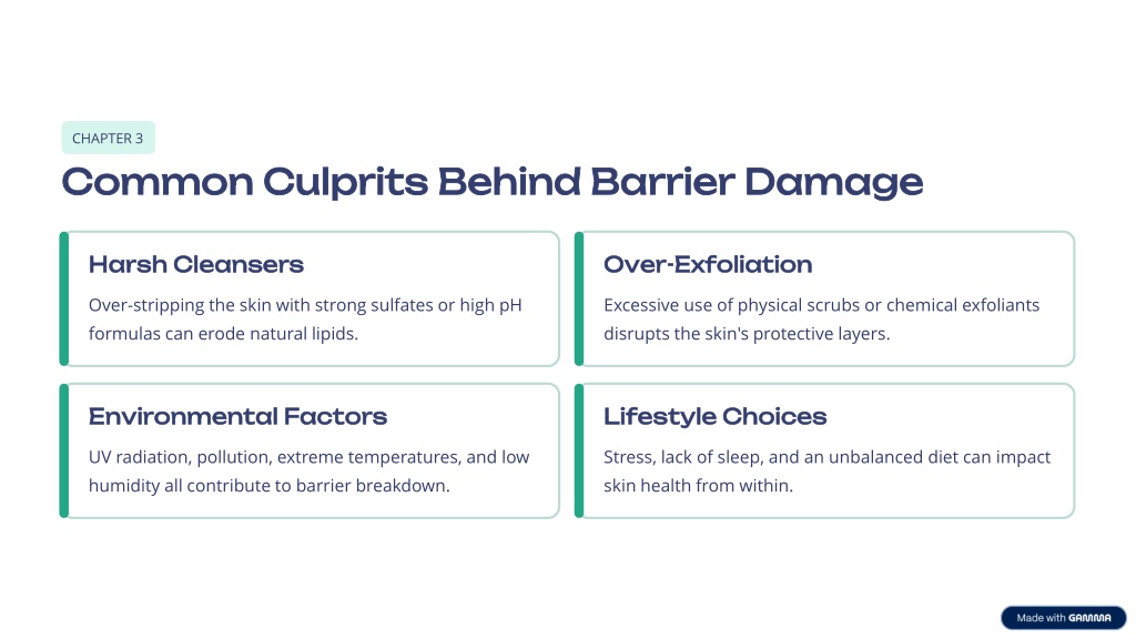 CHAPTER 3 Common Culprits Behind Barrier Damage Harsh Cleansers Over-Exfoliation Over-stripping the skin with strong sulfates or high pH formulas can erode natural lipids. Excessive use of physical scrubs or chemical exfoliants disrupts the skin's protective layers. Environmental Factors Lifestyle Choices UV radiation, pollution, extreme temperatures, and low humidity all contribute to barrier breakdown. Stress, lack of sleep, and an unbalanced diet can impact skin health from within.
