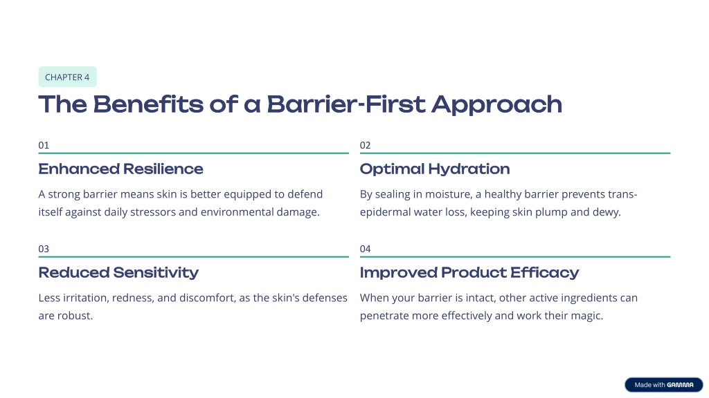 CHAPTER 4 The Benefits of a Barrier-First Approach 01 02 Enhanced Resilience Optimal Hydration A strong barrier means skin is better equipped to defend itself against daily stressors and environmental damage. By sealing in moisture, a healthy barrier prevents trans-epidermal water loss, keeping skin plump and dewy. 03 04 Reduced Sensitivity Improved Product Efficacy Less irritation, redness, and discomfort, as the skin's defenses are robust. When your barrier is intact, other active ingredients can penetrate more effectively and work their magic.