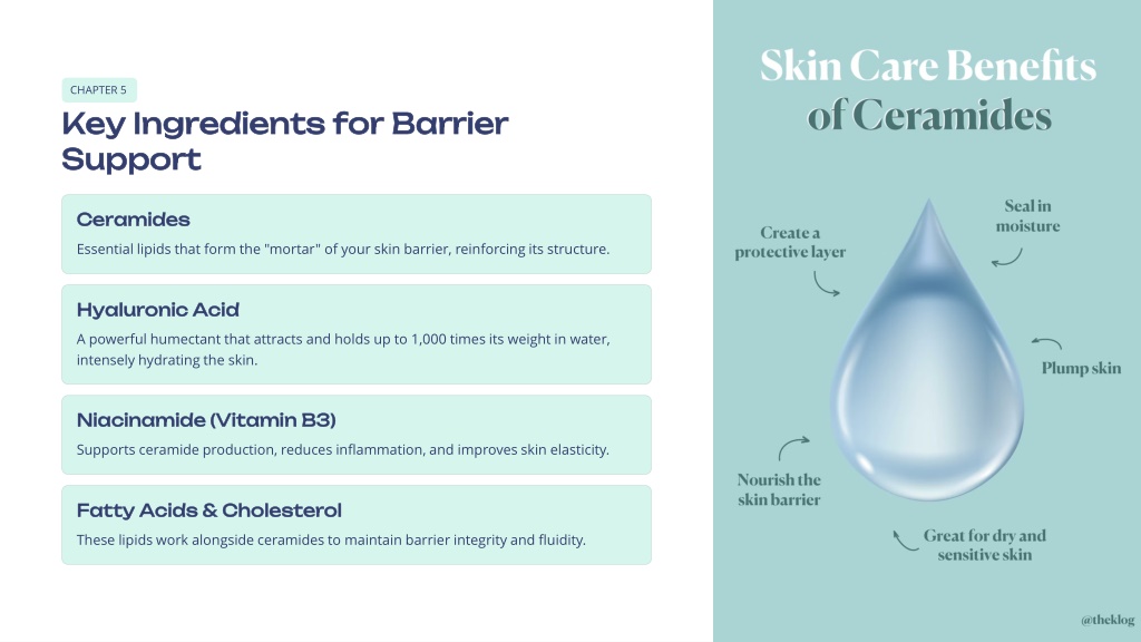 CHAPTER 5 Key Ingredients for Barrier Support Ceramides Essential lipids that form the "mortar" of your skin barrier, reinforcing its structure. Hyaluronic Acid A powerful humectant that attracts and holds up to 1,000 times its weight in water, intensely hydrating the skin. Niacinamide (Vitamin B3) Supports ceramide production, reduces inflammation, and improves skin elasticity. Fatty Acids & Cholesterol These lipids work alongside ceramides to maintain barrier integrity and fluidity.