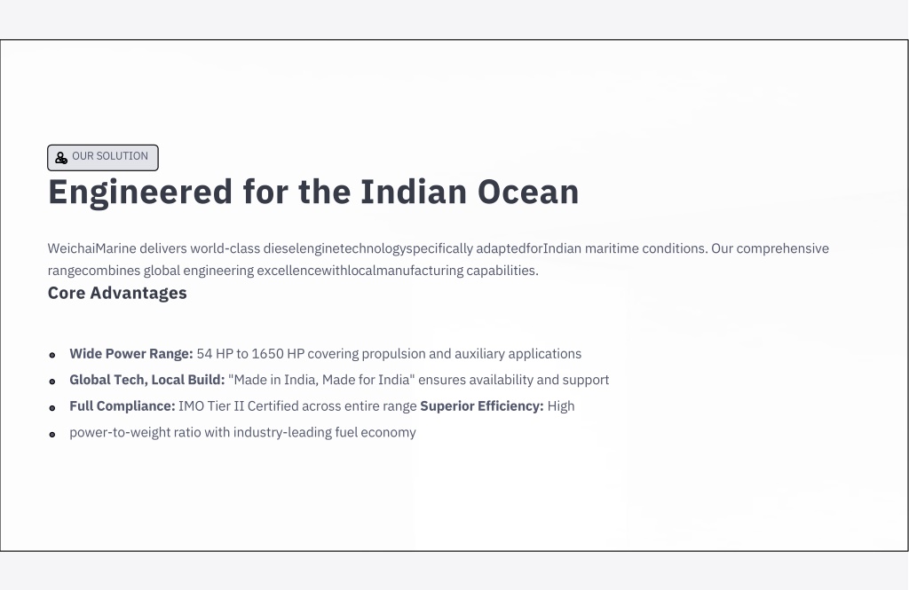 OUR SOLUTION Engineered for the Indian Ocean WeichaiMarine delivers world-class dieselenginetechnologyspecifically adaptedforIndian maritime conditions. Our comprehensive rangecombines global engineering excellencewithlocalmanufacturing capabilities. Core Advantages Wide Power Range: 54 HP to 1650 HP covering propulsion and auxiliary applications Global Tech, Local Build: "Made in India, Made for India" ensures availability and support Full Compliance: IMO Tier II Certified across entire range Superior Efficiency: High power-to-weight ratio with industry-leading fuel economy