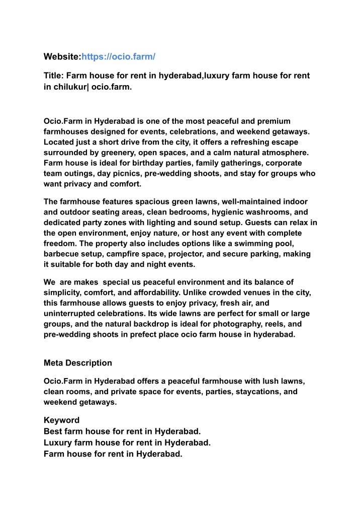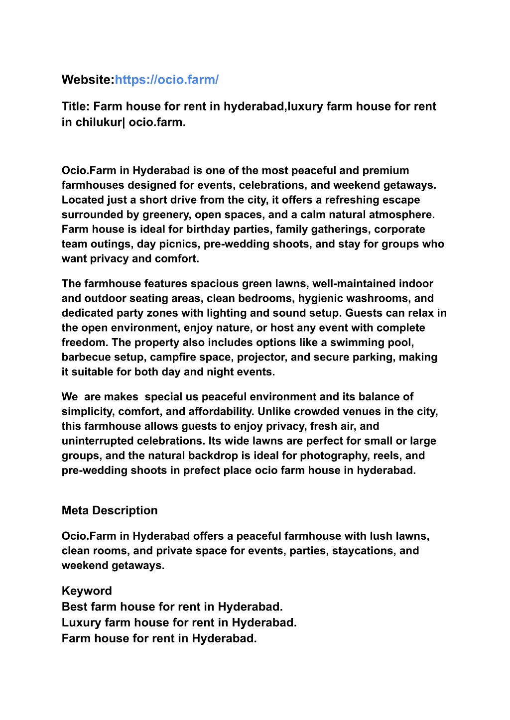 1. Website:https://ocio.farm/ Title: Farm house for rent in hyderabad,luxury farm house for rent in chilukur| ocio.farm. Ocio.Farm in Hyderabad is one of the most peaceful and premium farmhouses designed for events, celebrations, and weekend getaways. Located just a short drive from the city, it offers a refreshing escape surrounded by greenery, open spaces, and a calm natural atmosphere. Farm house is ideal for birthday parties, family gatherings, corporate team outings, day picnics, pre-wedding shoots, and stay for groups who want privacy and comfort. The farmhouse features spacious green lawns, well-maintained indoor and outdoor seating areas, clean bedrooms, hygienic washrooms, and dedicated party zones with lighting and sound setup. Guests can relax in the open environment, enjoy nature, or host any event with complete freedom. The property also includes options like a swimming pool, barbecue setup, campfire space, projector, and secure parking, making it suitable for both day and night events. We are makes special us peaceful environment and its balance of simplicity, comfort, and affordability. Unlike crowded venues in the city, this farmhouse allows guests to enjoy privacy, fresh air, and uninterrupted celebrations. Its wide lawns are perfect for small or large groups, and the natural backdrop is ideal for photography, reels, and pre-wedding shoots in prefect place ocio farm house in hyderabad. Meta Description Ocio.Farm in Hyderabad offers a peaceful farmhouse with lush lawns, clean rooms, and private space for events, parties, staycations, and weekend getaways. Keyword Best farm house for rent in Hyderabad. Luxury farm house for rent in Hyderabad. Farm house for rent in Hyderabad.