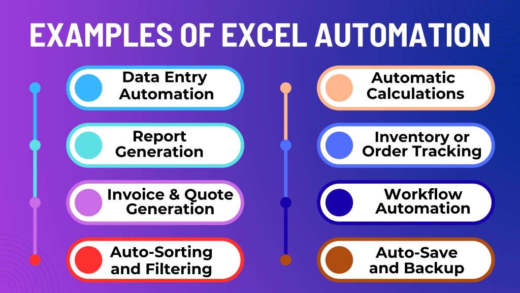 EXAMPLES OF EXCEL AUTOMATION Data Entry Automation Automatic Calculations Report Generation Inventory or Order Tracking Invoice & Quote Generation Workflow Automation Auto-Sorting and Filtering Auto-Save and Backup