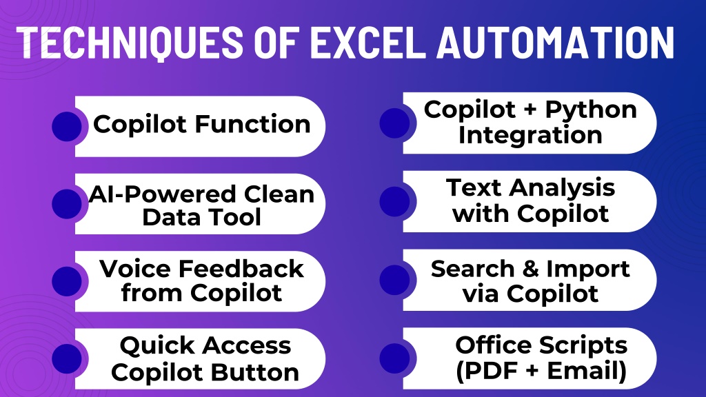 TECHNIQUES OF EXCEL AUTOMATION Copilot + Python Integration Copilot Function Text Analysis with Copilot AI‑Powered Clean Data Tool Search & Import via Copilot Voice Feedback from Copilot Quick Access Copilot Button Office Scripts (PDF + Email)