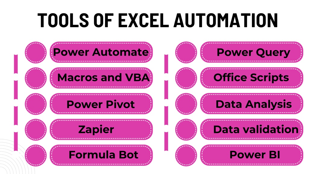 TOOLS OF EXCEL AUTOMATION Power Automate Power Query Macros and VBA Office Scripts Data Analysis Power Pivot Data validation Zapier Power BI Formula Bot