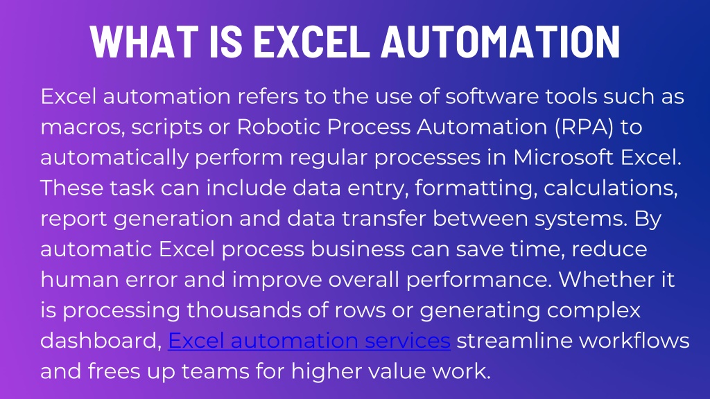 WHAT IS EXCEL AUTOMATION Excel automation refers to the use of software tools such as macros, scripts or Robotic Process Automation (RPA) to automatically perform regular processes in Microsoft Excel. These task can include data entry, formatting, calculations, report generation and data transfer between systems. By automatic Excel process business can save time, reduce human error and improve overall performance. Whether it is processing thousands of rows or generating complex dashboard, Excel automation services streamline workflows and frees up teams for higher value work.