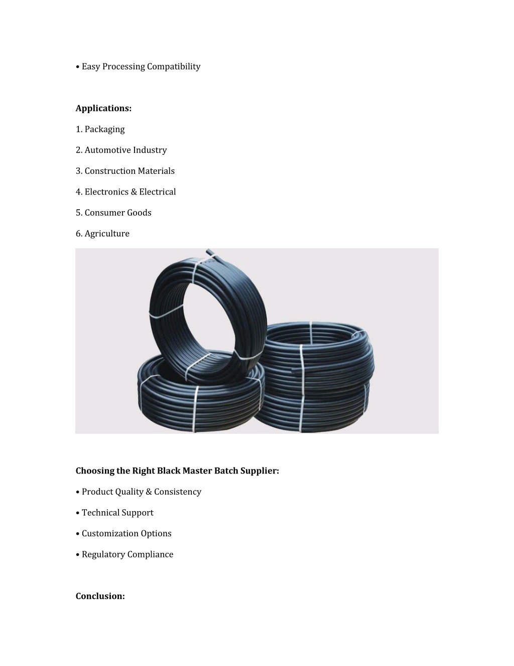 2. • Easy Processing Compatibility Applications: 1. Packaging 2. Automotive Industry 3. Construction Materials 4. Electronics & Electrical 5. Consumer Goods 6. Agriculture Choosing the Right Black Master Batch Supplier: • Product Quality & Consistency • Technical Support • Customization Options • Regulatory Compliance Conclusion: