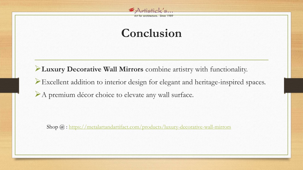 Conclusion • Luxury Decorative Wall Mirrors combine artistry with functionality. • Excellent addition to interior design for elegant and heritage-inspired spaces. • A premium décor choice to elevate any wall surface. Shop @ : https://metalartandartifact.com/products/luxury-decorative-wall-mirrors