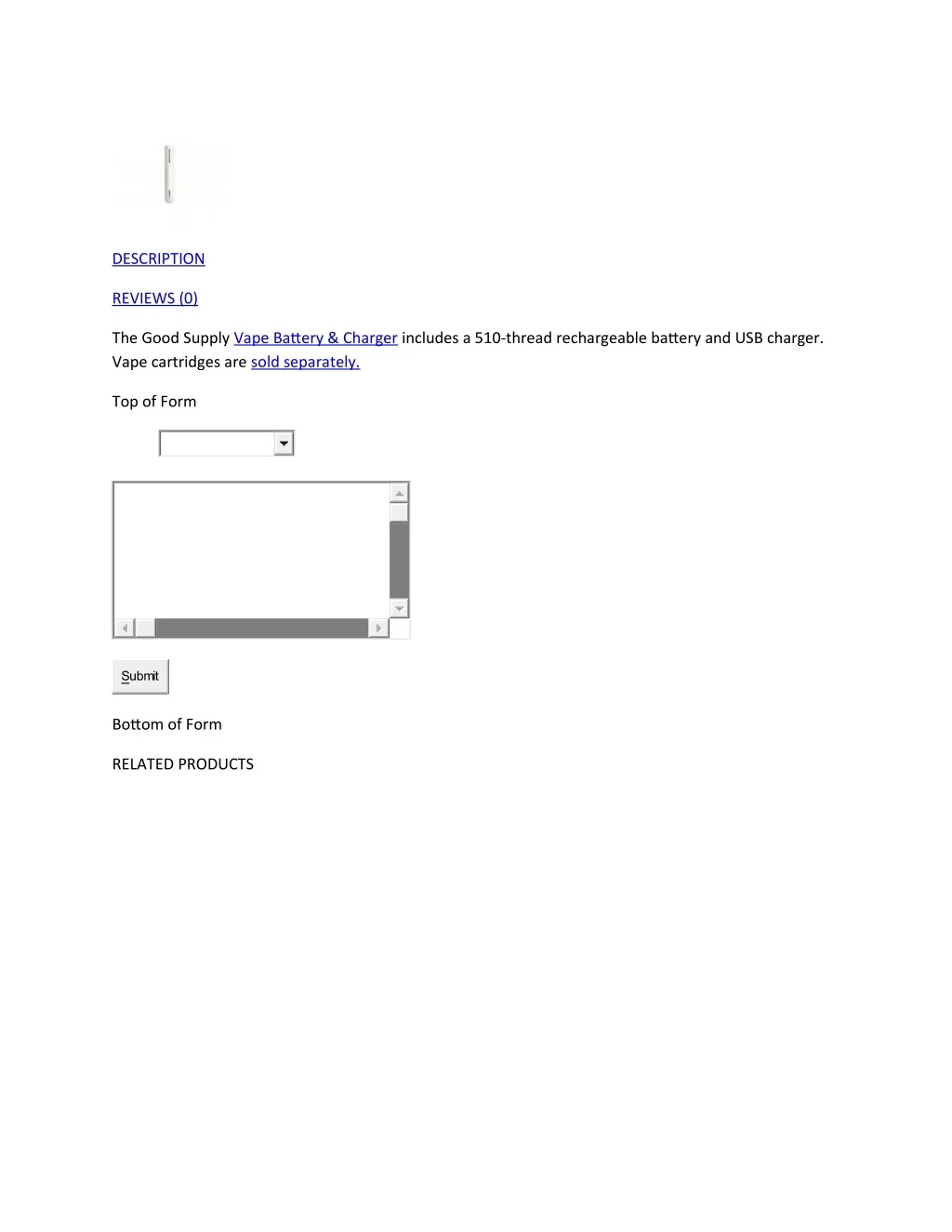 DESCRIPTION REVIEWS (0) The Good Supply Vape Battery & Charger includes a 510-thread rechargeable battery and USB charger. Vape cartridges are sold separately. Top of Form Submit Bottom of Form RELATED PRODUCTS