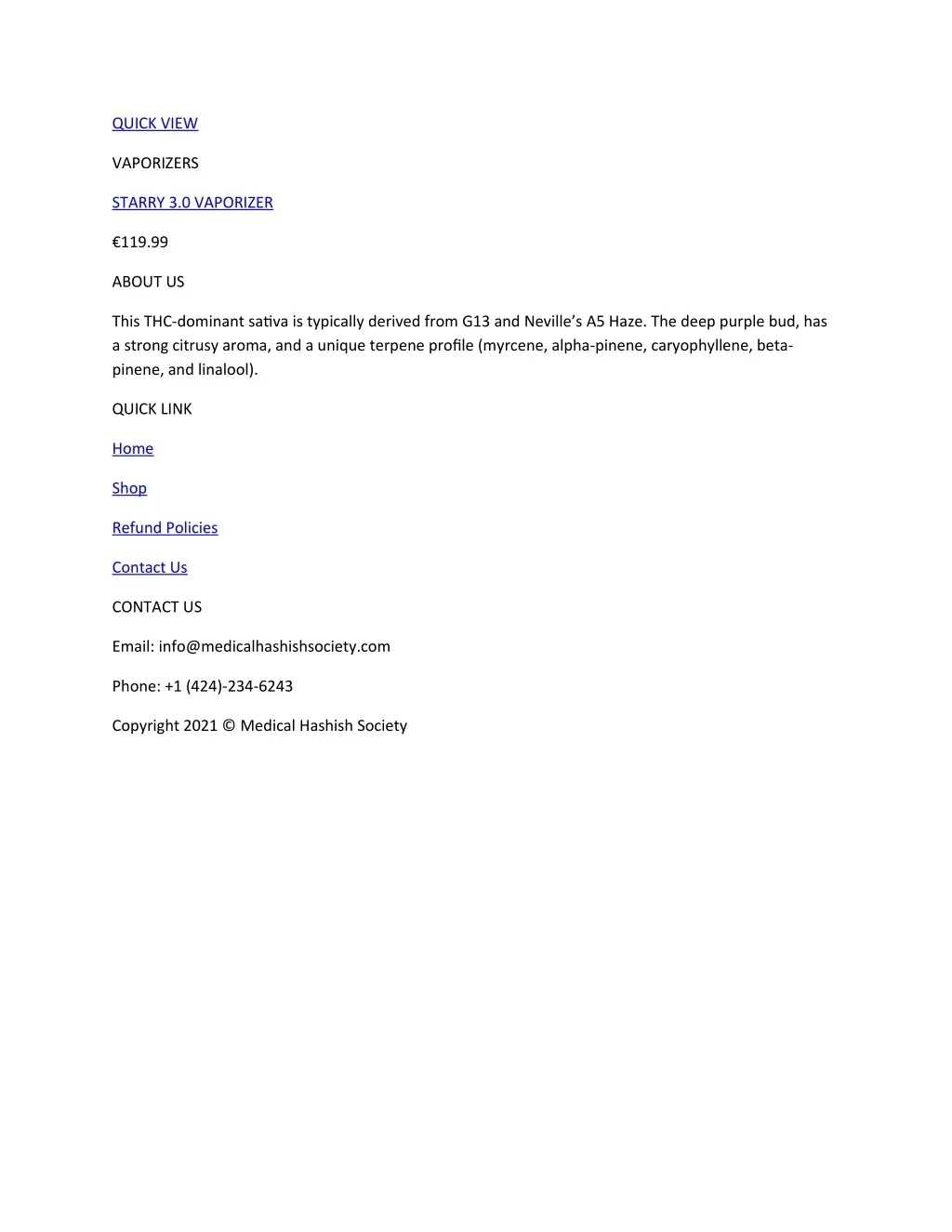 QUICK VIEW VAPORIZERS STARRY 3.0 VAPORIZER €119.99 ABOUT US This THC-dominant sativa is typically derived from G13 and Neville’s A5 Haze. The deep purple bud, has a strong citrusy aroma, and a unique terpene profile (myrcene, alpha-pinene, caryophyllene, beta- pinene, and linalool). QUICK LINK Home Shop Refund Policies Contact Us CONTACT US Email: info@medicalhashishsociety.com Phone: +1 (424)-234-6243 Copyright 2021 © Medical Hashish Society