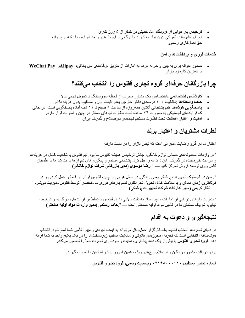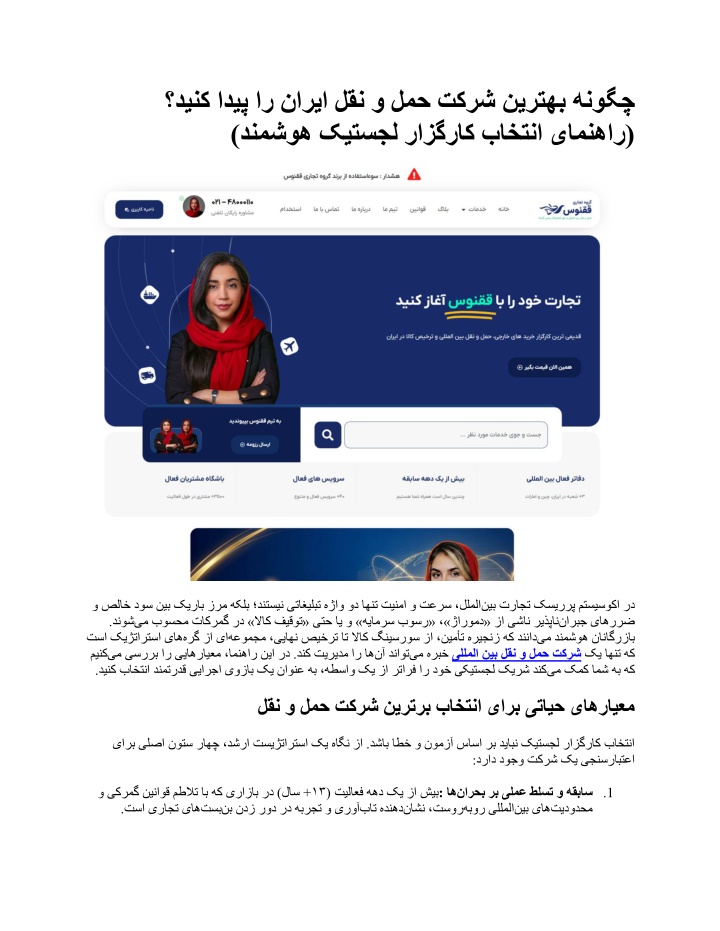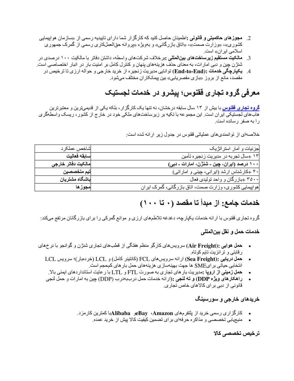: 2 . ییامیپاوه نامزاس« زا یمسر هیدییات یاراد امش رازگراک هک دینک لصاح نانیمطا لمعلا یروهمج کرمگ زا یمسر یراک ینوناق و یتیمکاح یاهزوجم هب و »یناگرزاب قاتا« ،»تمص ترازو« ،»یروشک قح هناورپ« هژیو . تسا »ناریا یملاسا تخاسریز میقتسم تیکلام : 3 . رد یدصرد . تیکلام اب رتافد نتشاد ،هطساو یاه تسا یصاصتخا رابنا رد راب تینما رب لماک لرتنک و ناهنپ یاه رد صیخرت ات یزرا هلاوح و یجراخ دیرخ زا هریجنز تیریدم ییاناوت ۱۰۰ تکرش فلاخرب یللملا نیب یاه هنیزه فذح یانعم هب ،تاراما یبد و نیچ نژنش (End-to-End): یم فلتخم ناراکنامیپ نیب »یبایرصقم یزاب« زورب زا عنام ،دصقم 4 . تامدخ یگچراپکی . دوش کیتسجل تامدخ رد ورشیپ ؛سونقق یراجت هورگ یفرعم یمیدق زا یکی هکلب ،رازگراک کی اهنت هن ،ناشخرد هقباس لاس نیرتربتعم و نیرت هطساو کسیر ،روشک زا جراخ رد دوخ یکلم یاه یرگ ۱۳ زا شیب اب سونقق یراجت هورگ تخاسریز رب هیکت اب هعومجم نیا .تسا ناریا یکیتسجل یاه باه . تسا هدناسر رفص هب ار : تسا هدش هئارا ریز لودج رد سونقق یتایلمع یاه یدنمناوت زا یا هصلاخ درکلمع صخاش تیلاعف هقباس یجراخ رتافد تیکلام نیصصختم میت نایرتشم هاگشاب کیژتارتسا رامآ و تایئزج + ۱۰۰ ۴۰ + ۳۵۰۰ نیمأت هریجنز تیریدم رد هبرجت لاس نیچ ،ناریا( دصرد - تاراما ،نژنش - )یبد )یتاراما و ینیچ ،یناریا( دشرا سانشراک لاعف یدیلوت دحاو و ناگرزاب ناریا کرمگ ،یناگرزاب قاتا ،تمص ترازو ،یروشک ییامیپاوه ۱۳ + اهزوجم ) ( دصقم ات أدبم زا :عماج تامدخ ۰ ات ۱۰۰ : یم عفترم ناناگرزاب یارب ار یکرمگ عناوم و یزرا یاه دنک مطلات هغدغد ،هچراپکی تامدخ هئارا اب سونقق یراجت هورگ نیب لقن و لمح تامدخ یللملا (Air Freight): سیورس هاتوک میات تیزنارت و یتباقر . (Sea Freight): سیورس هئارا SME هنیهب تهج اه هنیزه یزاس تروص هب یراجت یاهراب تیریدم یجنل هت و ): برد لمح تامدخ هئارا هب یراجت صاخ یاهلااک یارب یبد زا ینوناق . یاه خرن اب وجناوگ و نژنش یراجت یاه بطق زا یگتفه مظنم وگراک یاه ییاوه لمح • LCL LCL FCL سیورس ؛)راب هدرخ( . و )لماک رنیتناک( مک یاهراب لمح یاه تسا مجح LTL برد (DDP) یاه ییایرد لمح • یارب یتایح یباختنا اپورا زا ینیمز لمح هژیو یاهراکهار (DDP : . FTL و لااب ینمیا یاهدرادناتسا تیاعر اب یجنل لمح و تاراما هب نیچ • • گنیسروس و یجراخ یاهدیرخ Alibaba eBay و Amazon . دزمراک نیرتمک اب هدمع دیرخ زا شیپ لااک تیفیک نیمضت یارب یا . ، یاه مرفتلپ زا دیرخ یمسر یرازگراک هفرح هرکاذم و یصصخت یبای • • عبنم لاک یصصخت صیخرت
