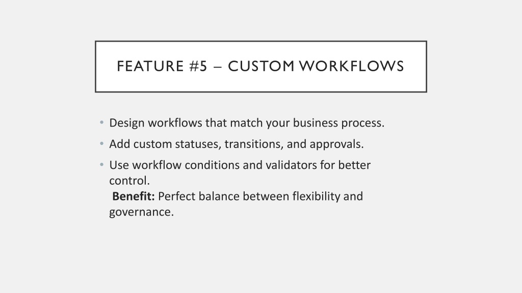 7. Feature #5 – Custom Workflows • Design workflows that match your business process. • Add custom statuses, transitions, and approvals. • Use workflow conditions and validators for better control.Benefit: Perfect balance between flexibility and governance.