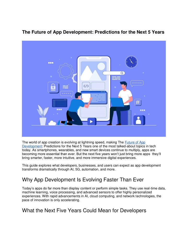 The Future of App Development: Predictions for the Next 5 Years The world of app creation is evolving at lightning speed, making The Future of App Development: Predictions for the Next 5 Years one of the most talked-about topics in tech today. As smartphones, wearables, and new smart devices continue to multiply, apps are becoming more essential than ever. But the next five years won’t just bring more appsthey’ll bring smarter, faster, more intuitive, and more immersive digital experiences. This guide explores what developers, businesses, and users can expect as app development transforms dramatically through AI, 5G, automation, and more. Why App Development Is Evolving Faster Than Ever Today’s apps do far more than display content or perform simple tasks. They use real-time data, machine learning, voice processing, and advanced sensors to offer highly personalized experiences. With rapid advancements in AI, cloud computing, and network technologies, the pace of innovation is only accelerating. What the Next Five Years Could Mean for Developers