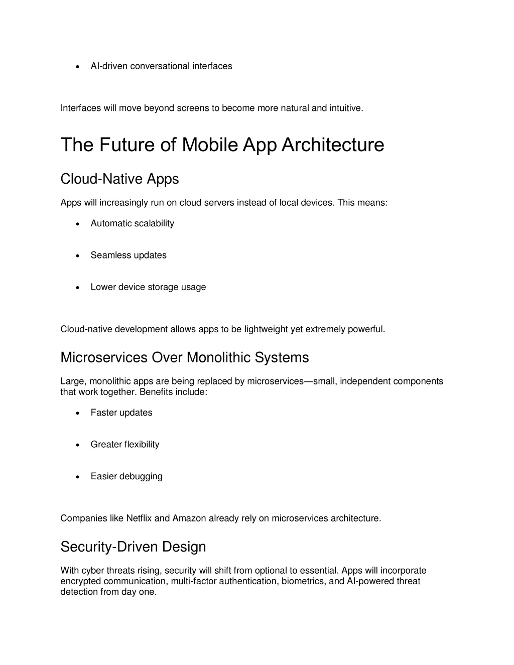 AI-driven conversational interfaces Interfaces will move beyond screens to become more natural and intuitive. The Future of Mobile App Architecture Cloud-Native Apps Apps will increasingly run on cloud servers instead of local devices. This means: Automatic scalability Seamless updates Lower device storage usage Cloud-native development allows apps to be lightweight yet extremely powerful. Microservices Over Monolithic Systems Large, monolithic apps are being replaced by microservices—small, independent components that work together. Benefits include: Faster updates Greater flexibility Easier debugging Companies like Netflix and Amazon already rely on microservices architecture. Security-Driven Design With cyber threats rising, security will shift from optional to essential. Apps will incorporate encrypted communication, multi-factor authentication, biometrics, and AI-powered threat detection from day one.