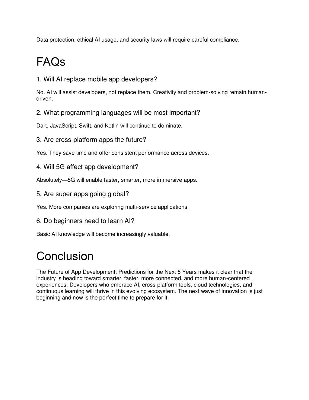 Data protection, ethical AI usage, and security laws will require careful compliance. FAQs 1. Will AI replace mobile app developers? No. AI will assist developers, not replace them. Creativity and problem-solving remain human- driven. 2. What programming languages will be most important? Dart, JavaScript, Swift, and Kotlin will continue to dominate. 3. Are cross-platform apps the future? Yes. They save time and offer consistent performance across devices. 4. Will 5G affect app development? Absolutely—5G will enable faster, smarter, more immersive apps. 5. Are super apps going global? Yes. More companies are exploring multi-service applications. 6. Do beginners need to learn AI? Basic AI knowledge will become increasingly valuable. Conclusion The Future of App Development: Predictions for the Next 5 Years makes it clear that the industry is heading toward smarter, faster, more connected, and more human-centered experiences. Developers who embrace AI, cross-platform tools, cloud technologies, and continuous learning will thrive in this evolving ecosystem. The next wave of innovation is just beginning and now is the perfect time to prepare for it.