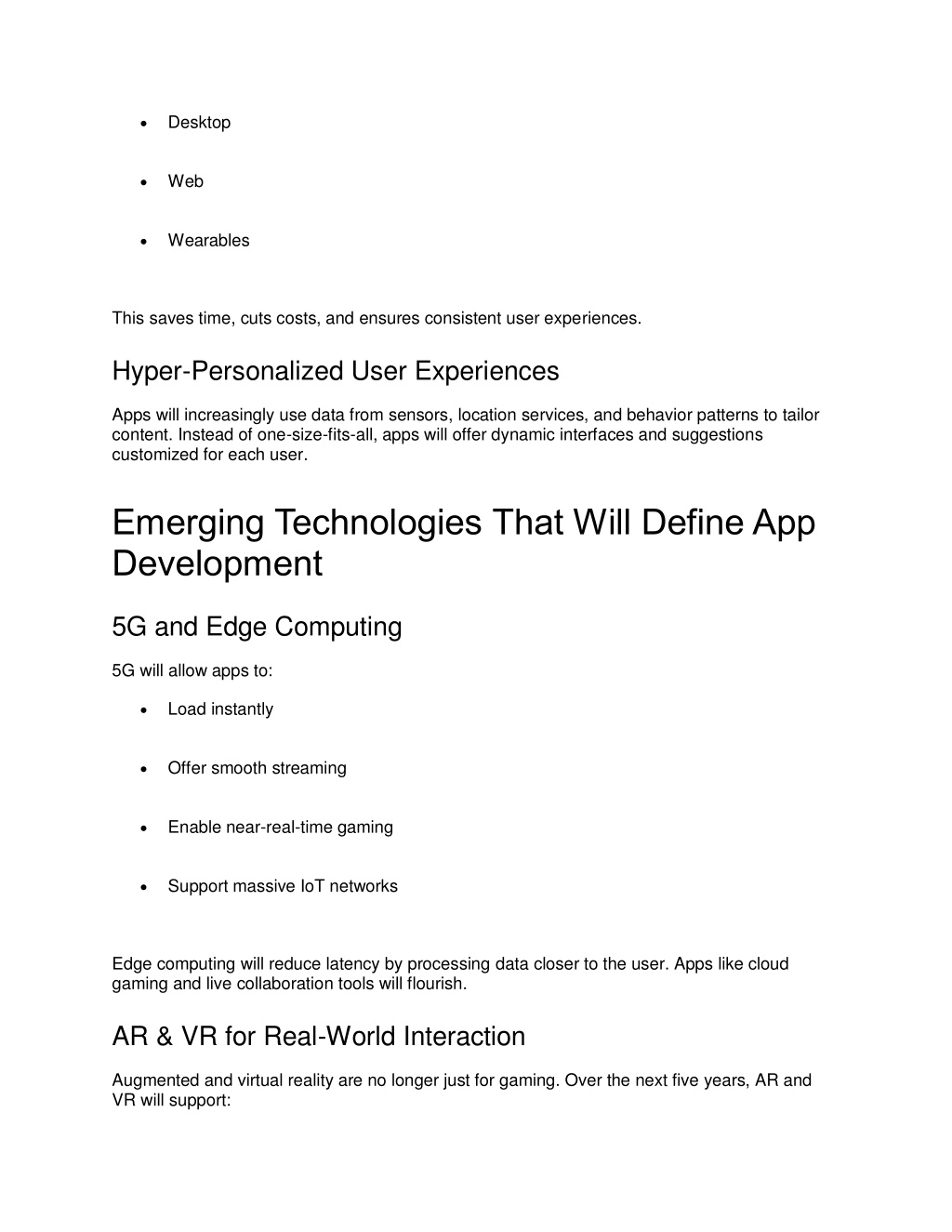 Desktop Web Wearables This saves time, cuts costs, and ensures consistent user experiences. Hyper-Personalized User Experiences Apps will increasingly use data from sensors, location services, and behavior patterns to tailor content. Instead of one-size-fits-all, apps will offer dynamic interfaces and suggestions customized for each user. Emerging Technologies That Will Define App Development 5G and Edge Computing 5G will allow apps to: Load instantly Offer smooth streaming Enable near-real-time gaming Support massive IoT networks Edge computing will reduce latency by processing data closer to the user. Apps like cloud gaming and live collaboration tools will flourish. AR & VR for Real-World Interaction Augmented and virtual reality are no longer just for gaming. Over the next five years, AR and VR will support: