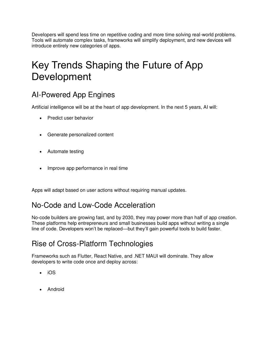 Developers will spend less time on repetitive coding and more time solving real-world problems. Tools will automate complex tasks, frameworks will simplify deployment, and new devices will introduce entirely new categories of apps. Key Trends Shaping the Future of App Development AI-Powered App Engines Artificial intelligence will be at the heart of app development. In the next 5 years, AI will: Predict user behavior Generate personalized content Automate testing Improve app performance in real time Apps will adapt based on user actions without requiring manual updates. No-Code and Low-Code Acceleration No-code builders are growing fast, and by 2030, they may power more than half of app creation. These platforms help entrepreneurs and small businesses build apps without writing a single line of code. Developers won’t be replaced—but they’ll gain powerful tools to build faster. Rise of Cross-Platform Technologies Frameworks such as Flutter, React Native, and .NET MAUI will dominate. They allow developers to write code once and deploy across: iOS Android