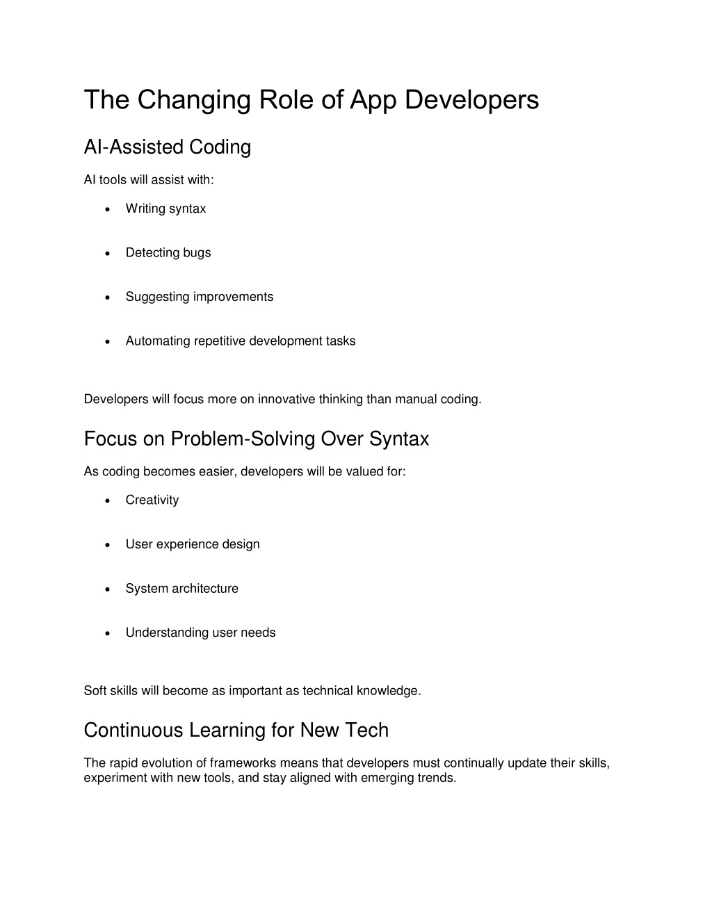 The Changing Role of App Developers AI-Assisted Coding AI tools will assist with: Writing syntax Detecting bugs Suggesting improvements Automating repetitive development tasks Developers will focus more on innovative thinking than manual coding. Focus on Problem-Solving Over Syntax As coding becomes easier, developers will be valued for: Creativity User experience design System architecture Understanding user needs Soft skills will become as important as technical knowledge. Continuous Learning for New Tech The rapid evolution of frameworks means that developers must continually update their skills, experiment with new tools, and stay aligned with emerging trends.
