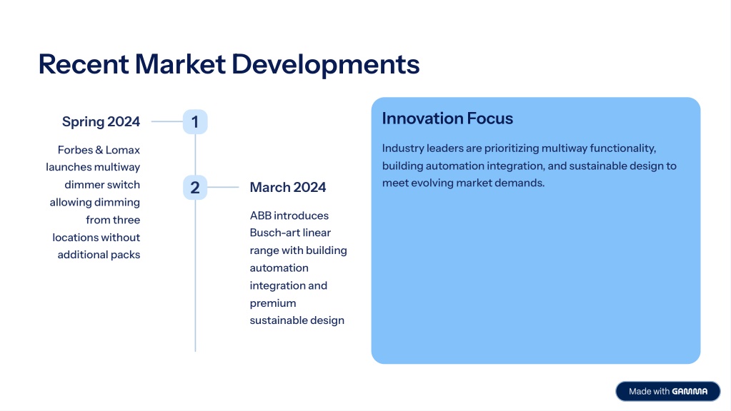 Recent Market Developments Innovation Focus 1 Spring 2024 Industry leaders are prioritizing multiway functionality, building automation integration, and sustainable design to meet evolving market demands. Forbes & Lomax launches multiway dimmer switch allowing dimming from three locations without additional packs 2 March 2024 ABB introduces Busch-art linear range with building automation integration and premium sustainable design