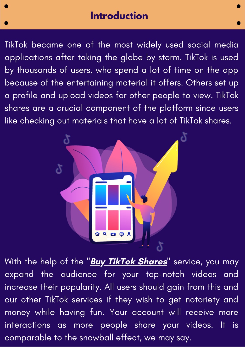 Introduction TikTok became one of the most widely used social media applications after taking the globe by storm. TikTok is used by thousands of users, who spend a lot of time on the app because of the entertaining material it offers. Others set up a profile and upload videos for other people to view. TikTok shares are a crucial component of the platform since users like checking out materials that have a lot of TikTok shares. With the help of the "Buy TikTok Shares" service, you may expand the audience for your top-notch videos and increase their popularity. All users should gain from this and our other TikTok services if they wish to get notoriety and money while having fun. Your account will receive more interactions as more people share your videos. It is comparable to the snowball effect, we may say.