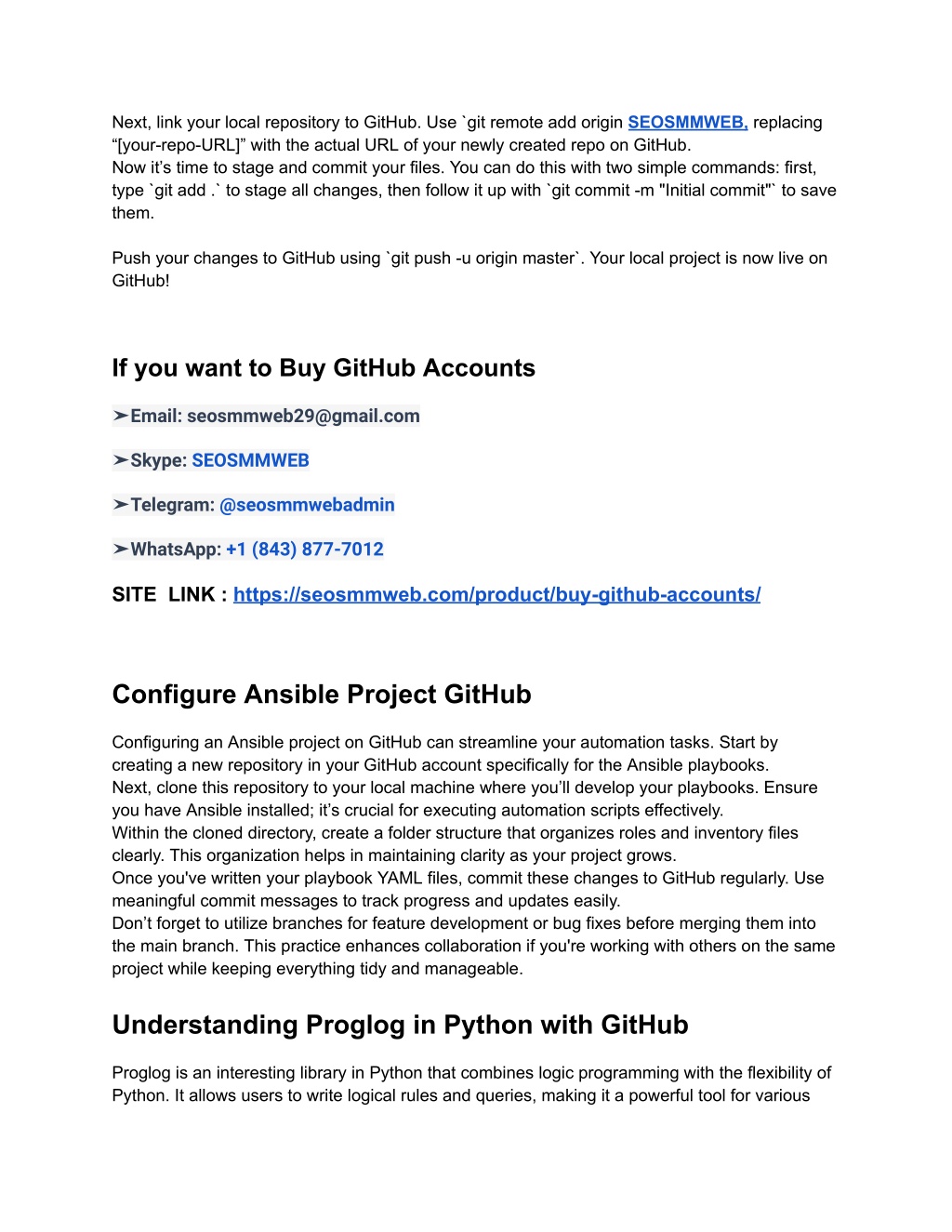 Next, link your local repository to GitHub. Use `git remote add origin SEOSMMWEB, replacing “[your-repo-URL]” with the actual URL of your newly created repo on GitHub. Now it’s time to stage and commit your files. You can do this with two simple commands: first, type `git add .` to stage all changes, then follow it up with `git commit -m "Initial commit"` to save them. Push your changes to GitHub using `git push -u origin master`. Your local project is now live on GitHub! If you want to Buy GitHub Accounts ➤Email: seosmmweb29@gmail.com ➤Skype: SEOSMMWEB ➤Telegram: @seosmmwebadmin ➤WhatsApp: +1 (843) 877-7012 SITE LINK : https://seosmmweb.com/product/buy-github-accounts/ Configure Ansible Project GitHub Configuring an Ansible project on GitHub can streamline your automation tasks. Start by creating a new repository in your GitHub account specifically for the Ansible playbooks. Next, clone this repository to your local machine where you’ll develop your playbooks. Ensure you have Ansible installed; it’s crucial for executing automation scripts effectively. Within the cloned directory, create a folder structure that organizes roles and inventory files clearly. This organization helps in maintaining clarity as your project grows. Once you've written your playbook YAML files, commit these changes to GitHub regularly. Use meaningful commit messages to track progress and updates easily. Don’t forget to utilize branches for feature development or bug fixes before merging them into the main branch. This practice enhances collaboration if you're working with others on the same project while keeping everything tidy and manageable. Understanding Proglog in Python with GitHub Proglog is an interesting library in Python that combines logic programming with the flexibility of Python. It allows users to write logical rules and queries, making it a powerful tool for various