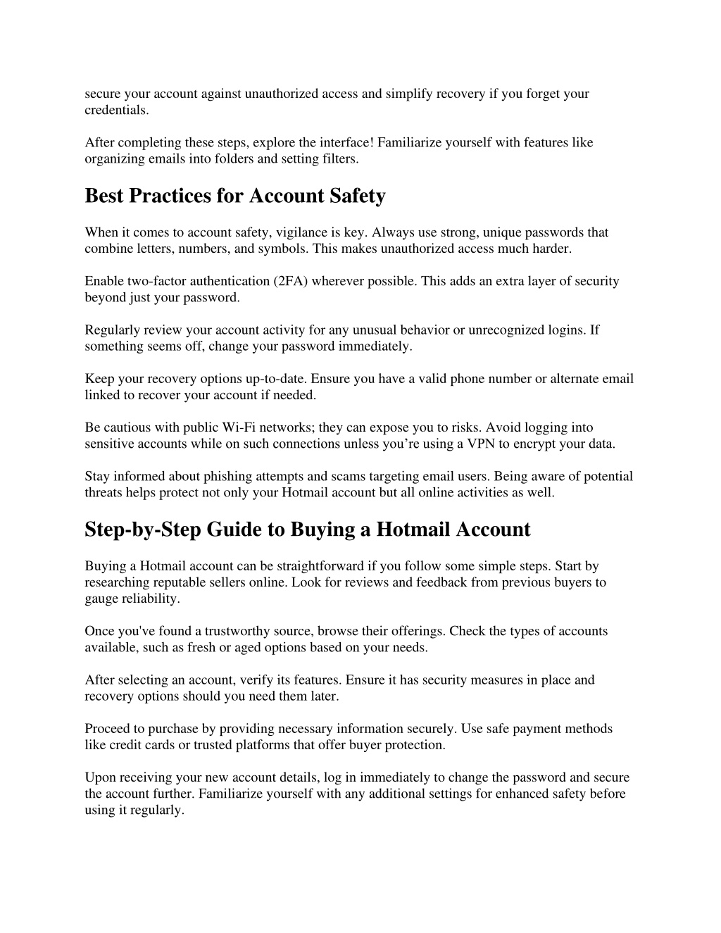 secure your account against unauthorized access and simplify recovery if you forget your credentials. After completing these steps, explore the interface! Familiarize yourself with features like organizing emails into folders and setting filters. Best Practices for Account Safety When it comes to account safety, vigilance is key. Always use strong, unique passwords that combine letters, numbers, and symbols. This makes unauthorized access much harder. Enable two-factor authentication (2FA) wherever possible. This adds an extra layer of security beyond just your password. Regularly review your account activity for any unusual behavior or unrecognized logins. If something seems off, change your password immediately. Keep your recovery options up-to-date. Ensure you have a valid phone number or alternate email linked to recover your account if needed. Be cautious with public Wi-Fi networks; they can expose you to risks. Avoid logging into sensitive accounts while on such connections unless you’re using a VPN to encrypt your data. Stay informed about phishing attempts and scams targeting email users. Being aware of potential threats helps protect not only your Hotmail account but all online activities as well. Step-by-Step Guide to Buying a Hotmail Account Buying a Hotmail account can be straightforward if you follow some simple steps. Start by researching reputable sellers online. Look for reviews and feedback from previous buyers to gauge reliability. Once you've found a trustworthy source, browse their offerings. Check the types of accounts available, such as fresh or aged options based on your needs. After selecting an account, verify its features. Ensure it has security measures in place and recovery options should you need them later. Proceed to purchase by providing necessary information securely. Use safe payment methods like credit cards or trusted platforms that offer buyer protection. Upon receiving your new account details, log in immediately to change the password and secure the account further. Familiarize yourself with any additional settings for enhanced safety before using it regularly.