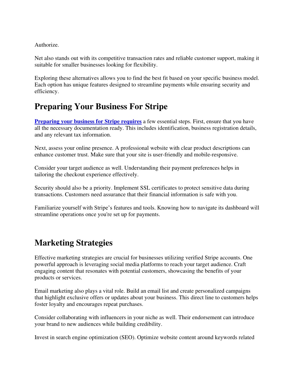 Authorize. Net also stands out with its competitive transaction rates and reliable customer support, making it suitable for smaller businesses looking for flexibility. Exploring these alternatives allows you to find the best fit based on your specific business model. Each option has unique features designed to streamline payments while ensuring security and efficiency. Preparing Your Business For Stripe Preparing your business for Stripe requires a few essential steps. First, ensure that you have all the necessary documentation ready. This includes identification, business registration details, and any relevant tax information. Next, assess your online presence. A professional website with clear product descriptions can enhance customer trust. Make sure that your site is user-friendly and mobile-responsive. Consider your target audience as well. Understanding their payment preferences helps in tailoring the checkout experience effectively. Security should also be a priority. Implement SSL certificates to protect sensitive data during transactions. Customers need assurance that their financial information is safe with you. Familiarize yourself with Stripe’s features and tools. Knowing how to navigate its dashboard will streamline operations once you're set up for payments. Marketing Strategies Effective marketing strategies are crucial for businesses utilizing verified Stripe accounts. One powerful approach is leveraging social media platforms to reach your target audience. Craft engaging content that resonates with potential customers, showcasing the benefits of your products or services. Email marketing also plays a vital role. Build an email list and create personalized campaigns that highlight exclusive offers or updates about your business. This direct line to customers helps foster loyalty and encourages repeat purchases. Consider collaborating with influencers in your niche as well. Their endorsement can introduce your brand to new audiences while building credibility. Invest in search engine optimization (SEO). Optimize website content around keywords related