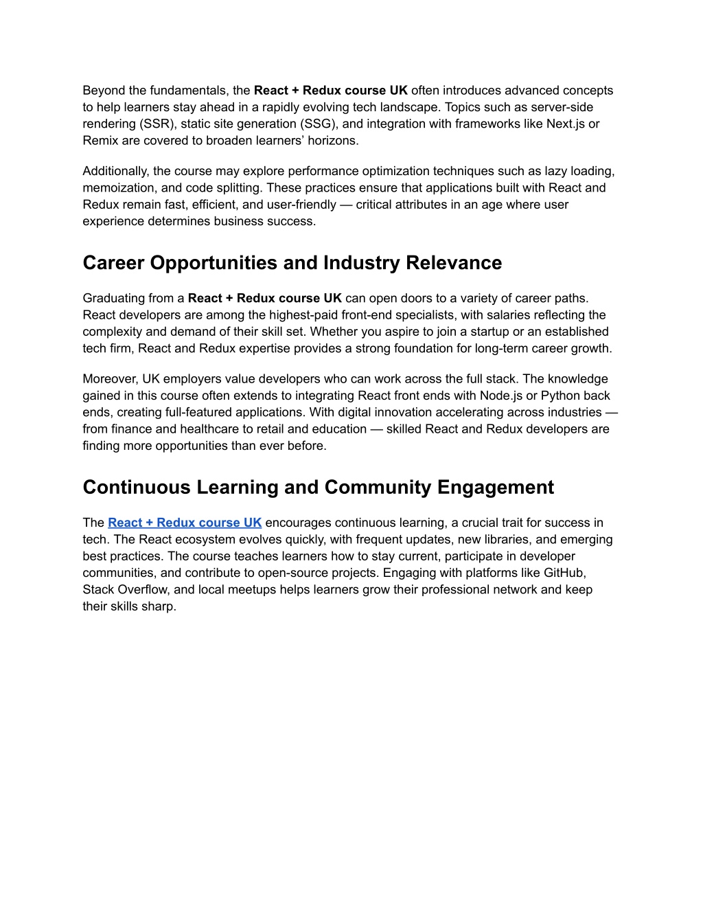 Beyond the fundamentals, the React + Redux course UK often introduces advanced concepts to help learners stay ahead in a rapidly evolving tech landscape. Topics such as server-side rendering (SSR), static site generation (SSG), and integration with frameworks like Next.js or Remix are covered to broaden learners’ horizons. Additionally, the course may explore performance optimization techniques such as lazy loading, memoization, and code splitting. These practices ensure that applications built with React and Redux remain fast, efficient, and user-friendly — critical attributes in an age where user experience determines business success. Career Opportunities and Industry Relevance Graduating from a React + Redux course UK can open doors to a variety of career paths. React developers are among the highest-paid front-end specialists, with salaries reflecting the complexity and demand of their skill set. Whether you aspire to join a startup or an established tech firm, React and Redux expertise provides a strong foundation for long-term career growth. Moreover, UK employers value developers who can work across the full stack. The knowledge gained in this course often extends to integrating React front ends with Node.js or Python back ends, creating full-featured applications. With digital innovation accelerating across industries — from finance and healthcare to retail and education — skilled React and Redux developers are finding more opportunities than ever before. Continuous Learning and Community Engagement The React + Redux course UK encourages continuous learning, a crucial trait for success in tech. The React ecosystem evolves quickly, with frequent updates, new libraries, and emerging best practices. The course teaches learners how to stay current, participate in developer communities, and contribute to open-source projects. Engaging with platforms like GitHub, Stack Overflow, and local meetups helps learners grow their professional network and keep their skills sharp.