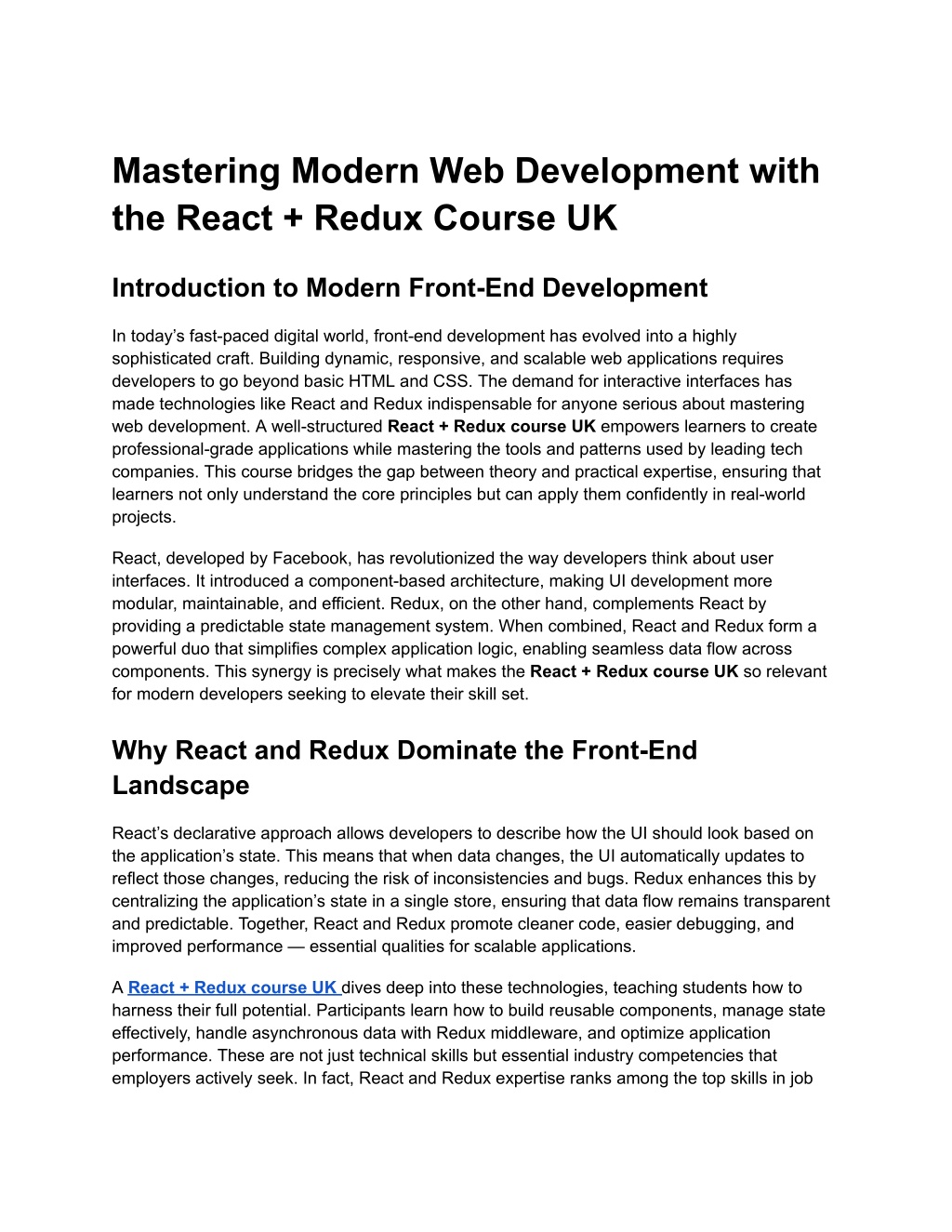Mastering Modern Web Development with the React + Redux Course UK Introduction to Modern Front-End Development In today’s fast-paced digital world, front-end development has evolved into a highly sophisticated craft. Building dynamic, responsive, and scalable web applications requires developers to go beyond basic HTML and CSS. The demand for interactive interfaces has made technologies like React and Redux indispensable for anyone serious about mastering web development. A well-structured React + Redux course UK empowers learners to create professional-grade applications while mastering the tools and patterns used by leading tech companies. This course bridges the gap between theory and practical expertise, ensuring that learners not only understand the core principles but can apply them confidently in real-world projects. React, developed by Facebook, has revolutionized the way developers think about user interfaces. It introduced a component-based architecture, making UI development more modular, maintainable, and efficient. Redux, on the other hand, complements React by providing a predictable state management system. When combined, React and Redux form a powerful duo that simplifies complex application logic, enabling seamless data flow across components. This synergy is precisely what makes the React + Redux course UK so relevant for modern developers seeking to elevate their skill set. Why React and Redux Dominate the Front-End Landscape React’s declarative approach allows developers to describe how the UI should look based on the application’s state. This means that when data changes, the UI automatically updates to reflect those changes, reducing the risk of inconsistencies and bugs. Redux enhances this by centralizing the application’s state in a single store, ensuring that data flow remains transparent and predictable. Together, React and Redux promote cleaner code, easier debugging, and improved performance — essential qualities for scalable applications. A React + Redux course UKdives deep into these technologies, teaching students how to harness their full potential. Participants learn how to build reusable components, manage state effectively, handle asynchronous data with Redux middleware, and optimize application performance. These are not just technical skills but essential industry competencies that employers actively seek. In fact, React and Redux expertise ranks among the top skills in job