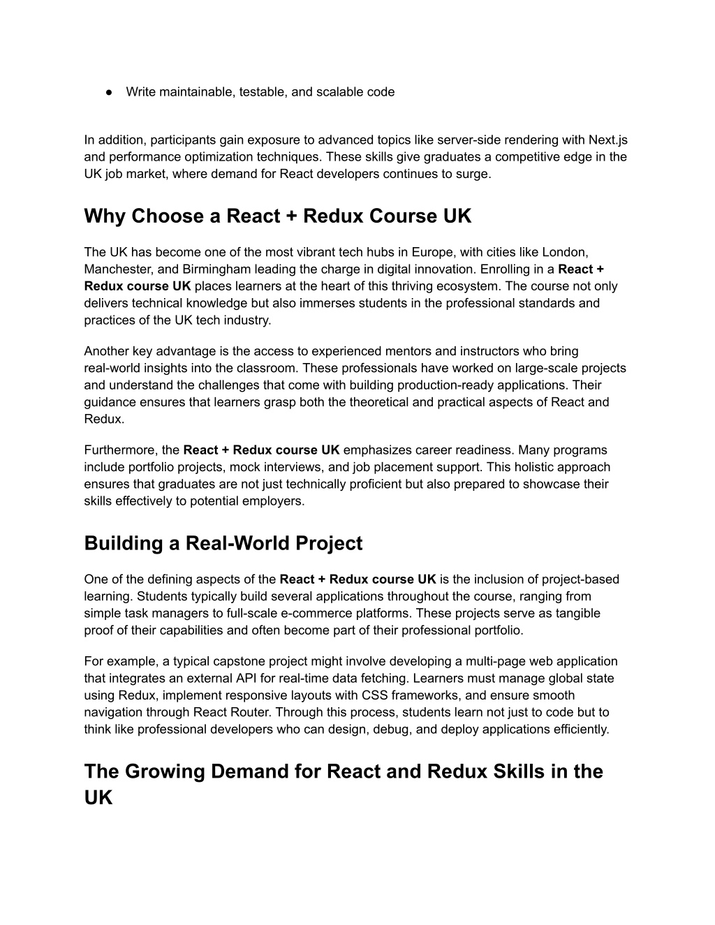 ● Write maintainable, testable, and scalable code In addition, participants gain exposure to advanced topics like server-side rendering with Next.js and performance optimization techniques. These skills give graduates a competitive edge in the UK job market, where demand for React developers continues to surge. Why Choose a React + Redux Course UK The UK has become one of the most vibrant tech hubs in Europe, with cities like London, Manchester, and Birmingham leading the charge in digital innovation. Enrolling in a React + Redux course UK places learners at the heart of this thriving ecosystem. The course not only delivers technical knowledge but also immerses students in the professional standards and practices of the UK tech industry. Another key advantage is the access to experienced mentors and instructors who bring real-world insights into the classroom. These professionals have worked on large-scale projects and understand the challenges that come with building production-ready applications. Their guidance ensures that learners grasp both the theoretical and practical aspects of React and Redux. Furthermore, the React + Redux course UK emphasizes career readiness. Many programs include portfolio projects, mock interviews, and job placement support. This holistic approach ensures that graduates are not just technically proficient but also prepared to showcase their skills effectively to potential employers. Building a Real-World Project One of the defining aspects of the React + Redux course UK is the inclusion of project-based learning. Students typically build several applications throughout the course, ranging from simple task managers to full-scale e-commerce platforms. These projects serve as tangible proof of their capabilities and often become part of their professional portfolio. For example, a typical capstone project might involve developing a multi-page web application that integrates an external API for real-time data fetching. Learners must manage global state using Redux, implement responsive layouts with CSS frameworks, and ensure smooth navigation through React Router. Through this process, students learn not just to code but to think like professional developers who can design, debug, and deploy applications efficiently. The Growing Demand for React and Redux Skills in the UK