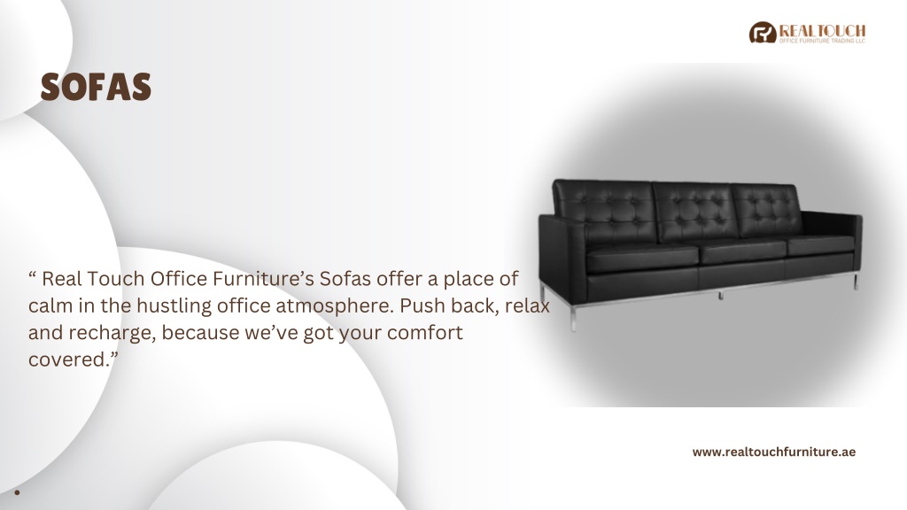 SOFAS “ Real Touch Office Furniture’s Sofas offer a place of calm in the hustling office atmosphere. Push back, relax and recharge, because we’ve got your comfort covered.” www.realtouchfurniture.ae
