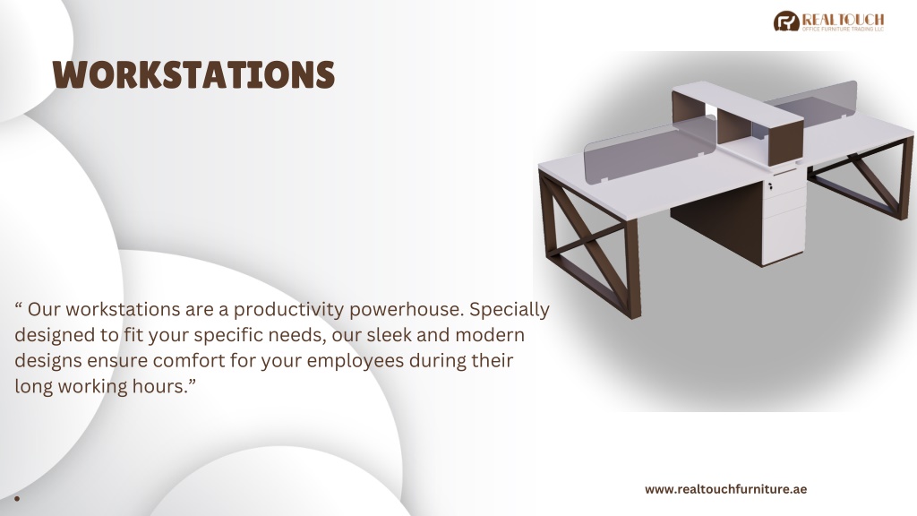 WORKSTATIONS “ Our workstations are a productivity powerhouse. Specially designed to fit your specific needs, our sleek and modern designs ensure comfort for your employees during their long working hours.” www.realtouchfurniture.ae