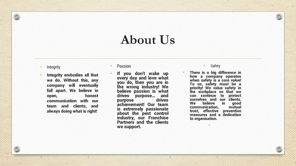 About Us • Passion • If you don’t wake up every day and love what you do, then you are in the wrong industry! We believe passion is what drives purpose… and purpose drives achievement! Our team is extremely passionate about the pest control industry, our Franchise Partners and the clients we support. • Integrity • Integrity embodies all that we do. Without this, any company will eventually fall apart. We believe in open, honest communication with our team and clients, and always doing what is right! • Safety • There is a big difference in how a company operates when safety is a core value! To us, safety must be a priority! We value safety in the workplace so that we can continue to protect ourselves and our clients. We believe in good communication, mutual trust, effective preventive measures and a dedication to organisation.