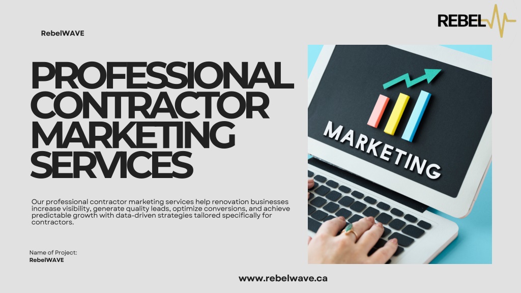 RebelWAVE PROFESSIONAL CONTRACTOR MARKETING SERVICES Our professional contractor marketing services help renovation businesses increase visibility, generate quality leads, optimize conversions, and achieve predictable growth with data-driven strategies tailored specifically for contractors. Name of Project: RebelWAVE www.rebelwave.ca