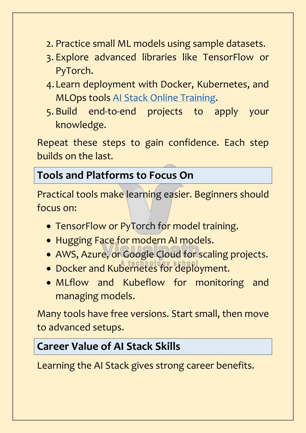 How to Practice Every Day Daily practice builds strong skills. Here’s a simple routine: Spend 1–2 hours coding daily. Work on mini projects weekly. Read simple guides or documentation. Share work with peers for feedback. Keep a journal of what you learn AI Stack Online Training. Small, consistent steps are better than long, irregular study sessions. Final Thoughts The AI Stack is the most in-demand skill for 2025. It brings together data, models, and tools into one system. By learning step by step, you can build a strong career. Start with the basics, then move to advanced tools. Work on projects, get expert guidance, and keep practicing. Institutes like Visualpath can speed up your journey with expert-led training. This PDF explains why the AI Stack is shaping the future, the key skills you need, and how to build your career step by step. It is designed for beginners and IT professionals who want to stay ahead.