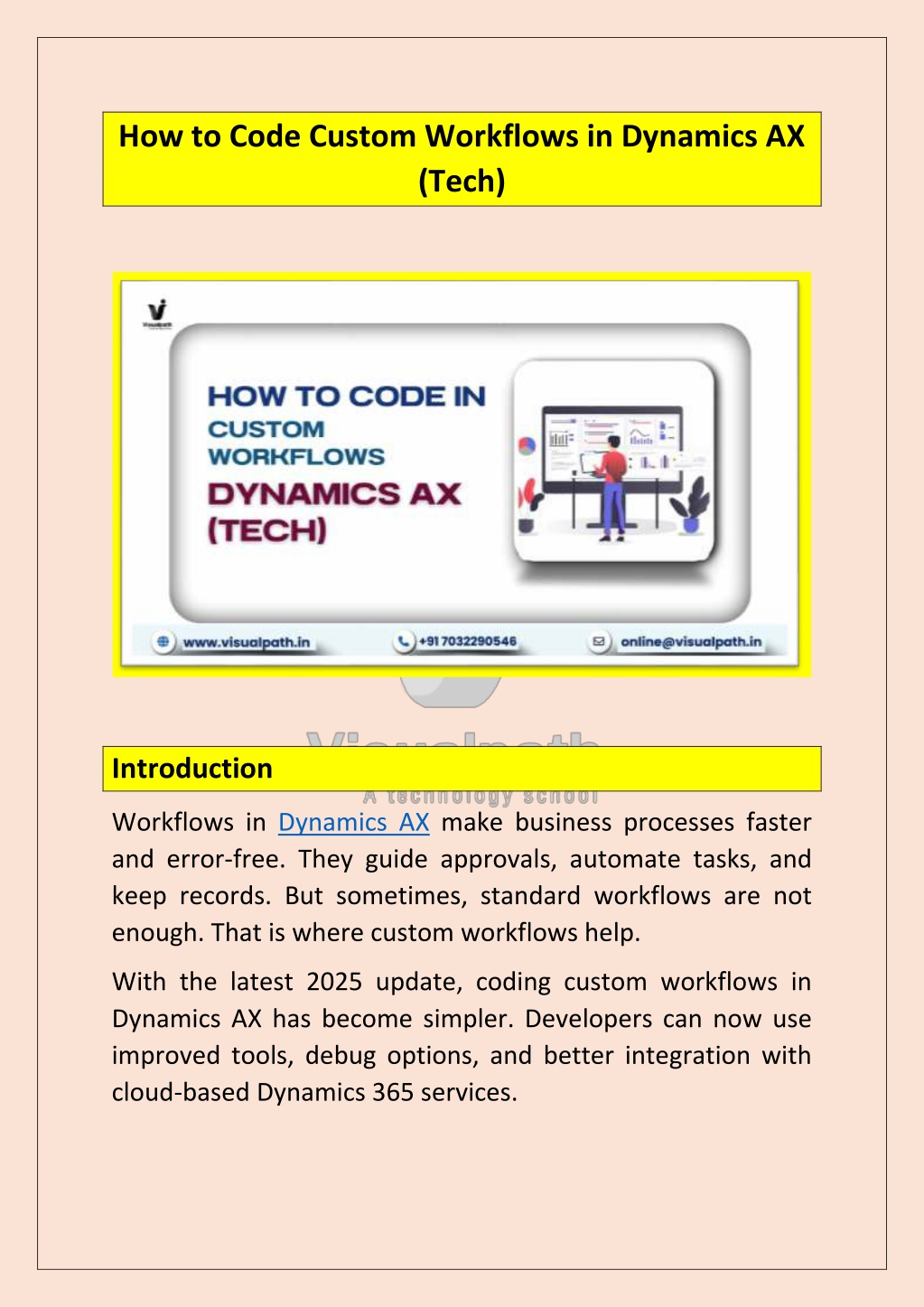 You can create it by defining workflow types, handlers, and approvals in Visual Studio. Visualpath training institute covers these steps in detail. Q2. What is the difference between custom action and customworkflow? A custom action is a single operation. A workflow includes multiple steps and approvals. For deeper practice, learners choose MicroSoft Ax Training programs. Conclusion Coding custom workflows in Dynamics AX is an essential skill in 2025. Businesses demand flexibility and automation more than ever. By learning the steps, concepts, and examples, you can build workflows that fit any business. Training programs like MicroSoft Dynamics AX Training in India and MicroSoft Ax Training help professionals gain practical skills with real projects. Custom workflows are no longer just optional. They are the backbone of efficient business processes in Dynamics AX today. For more Details Contact +91 7032290546 Visit: https://www.visualpath.in/online-microsoft- dynamics-ax-technical-training.html