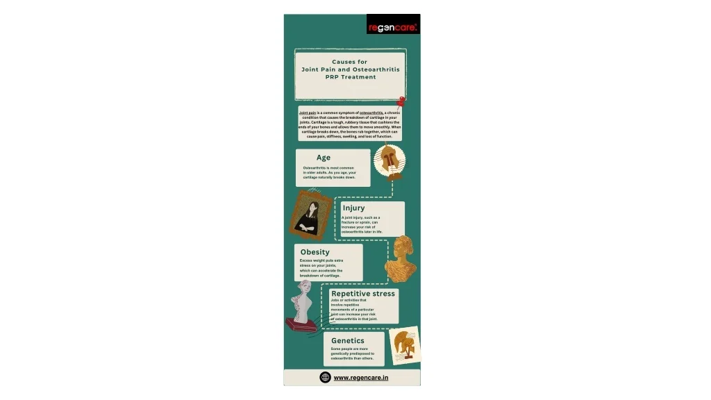 Causes for Joint Pain and Osteoarthritis PRP Treatment Joint pain is a common symptom of osteoarthritis, a chronic condition that causes the breakdown of cartilage in your joints. Cartilage is a tough, rubbery tissue that cushions the ends of your bones and allows them to move smoothly. When cartilage breaks down, the bones rub together, which can cause pain, stiffness, swelling, and loss of function. Age Osteoarthritis is most common in older adults. As you age, your cartilage naturally breaks down. Injury A joint injury, such as a fracture or sprain, can increase your risk of osteoarthritis later in life. Obesity Excess weight puts extra stress on your joints, which can accelerate the breakdown of cartilage. Repetitive stress Jobs or activities that involve repetitive movements of a particular joint can increase your risk of osteoarthritis in that joint. Genetics Some people are more genetically predisposed to osteoarthritis than others. www.regencare.in