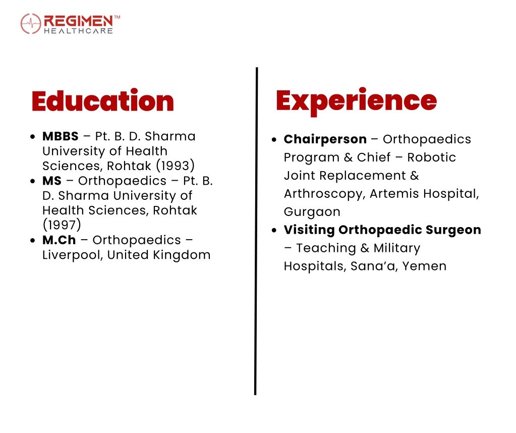 Experience Education MBBS – Pt. B. D. Sharma University of Health Sciences, Rohtak (1993) MS – Orthopaedics – Pt. B. D. Sharma University of Health Sciences, Rohtak (1997) M.Ch – Orthopaedics – Liverpool, United Kingdom Chairperson – Orthopaedics Program & Chief – Robotic Joint Replacement & Arthroscopy, Artemis Hospital, Gurgaon Visiting Orthopaedic Surgeon – Teaching & Military Hospitals, Sana’a, Yemen