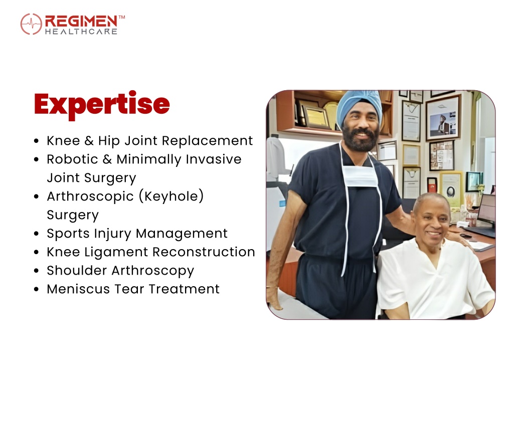 Awards & Achievements Memberships Youngest President – Indian Arthroscopy Society International training in joint replacement and arthroscopy (UK, Germany, France, South Africa) Published research in leading orthopaedic journals Renowned for high success rates in complex joint surgeries American Academy of Orthopaedic Surgeons (AAOS) International Society of Arthroscopy, Knee Surgery & Orthopaedic Sports Medicine (ISAKOS) Indian Orthopaedic Association (IOA) Indian Arthroplasty Society Indian Arthroscopy Society Book an Appointment Call / WhatsApp: +91 9310356465 Email: query@regimenhealthcare.com www.regimenhealth.com Website: