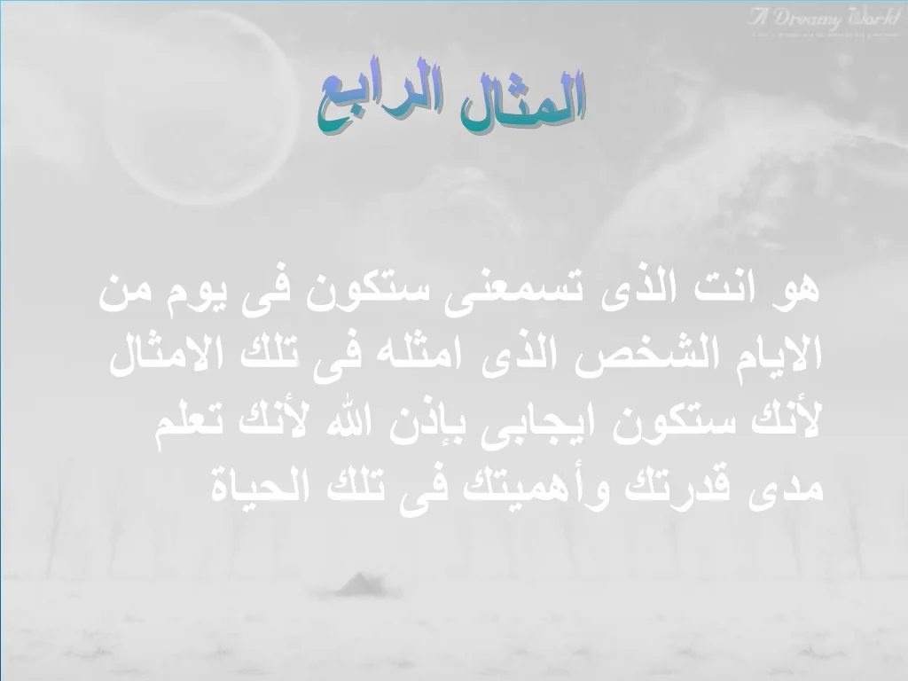 المثال الرابع هو انت الذى تسمعنى ستكون فى يوم من الايام الشخص الذى امثله فى تلك الامثال لأنك ستكون ايجابى بإذن الله لأنك تعلم مدى قدرتك وأهميتك فى تلك الحياة