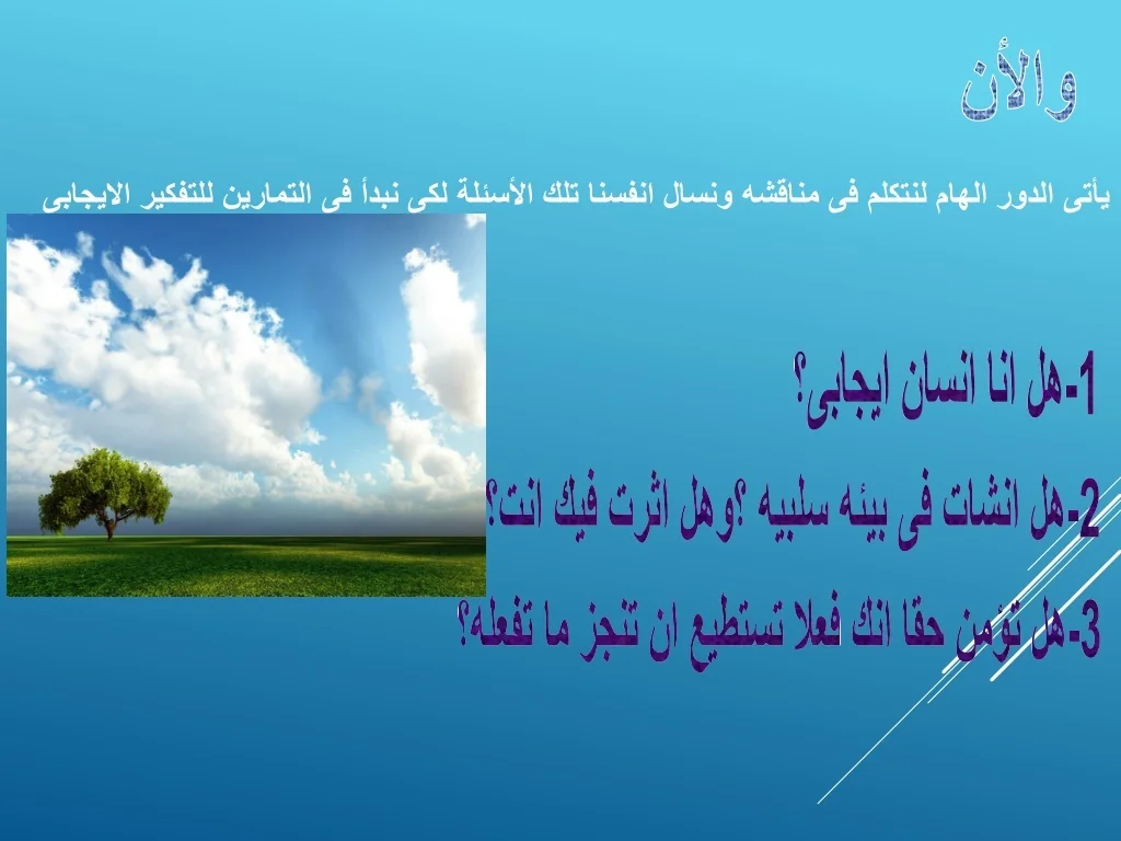والأن يأتى الدور الهام لنتكلم فى مناقشه ونسال انفسنا تلك الأسئلة لكى نبدأ فى التمارين للتفكير الايجابى 1-هل انا انسان ايجابى؟ 1-هل انا انسان ايجابى؟ 2-هل انشات فى بيئه سلبيه ؟وهل اثرت فيك انت؟ 2-هل انشات فى بيئه سلبيه ؟وهل اثرت فيك انت؟ 3-هل تؤمن حقا انك فعلا تستطيع ان تنجز ما تفعله؟ 3-هل تؤمن حقا انك فعلا تستطيع ان تنجز ما تفعله؟