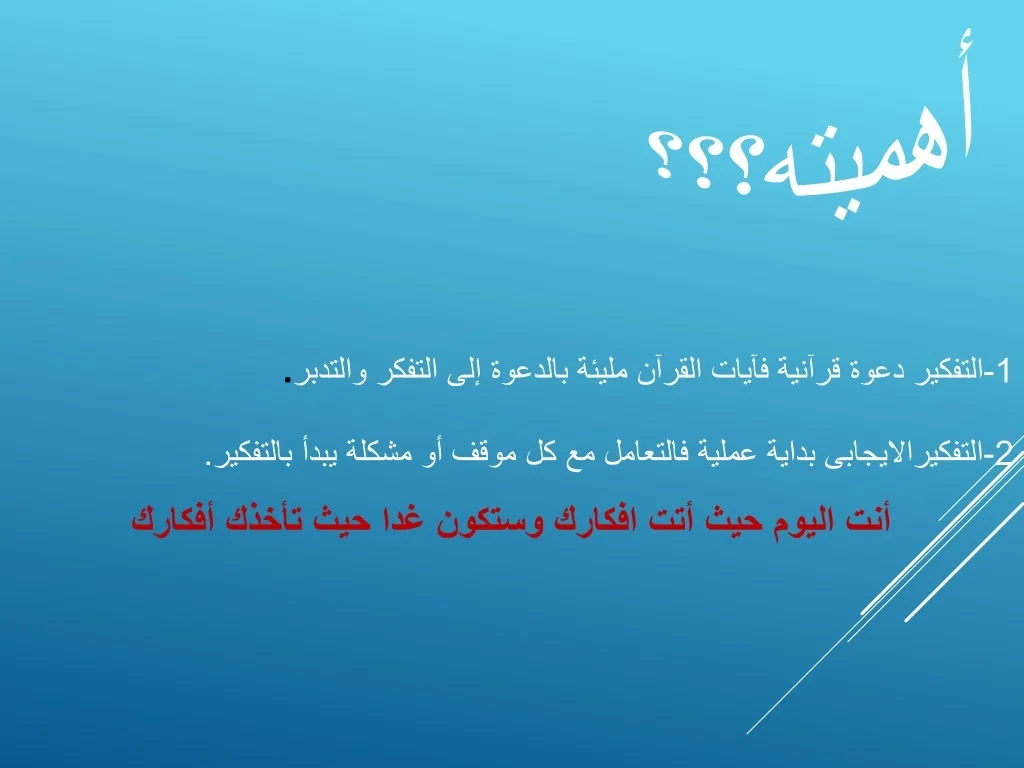 أهميته؟؟؟ 1-التفكير دعوة قرآنية فآيات القرآن مليئة بالدعوة إلى التفكر والتدبر. 2-التفكيرالايجابى بداية عملية فالتعامل مع كل موقف أو مشكلة يبدأ بالتفكير. أنت اليوم حيث أتت افكارك وستكون غدا حيث تأخذك أفكارك