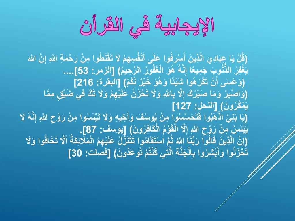 الإيجابية في القرأن (قُلْ يَا عِبَادِيَ الَّذِينَ أَسْرَفُوا عَلَى أَنْفُسِهِمْ لَا تَقْنَطُوا مِنْ رَحْمَةِ اللَّهِ إِنَّ اللَّهَ يَغْفِرُ الذُّنُوبَ جَمِيعًا إِنَّهُ هُوَ الْغَفُورُ الرَّحِيمُ) [الزمر: 53].... (وَعَسَى أَنْ تَكْرَهُوا شَيْئًا وَهُوَ خَيْرٌ لَكُمْ) [البقرة: 216] (وَاصْبِرْ وَمَا صَبْرُكَ إِلَّا بِاللَّهِ وَلَا تَحْزَنْ عَلَيْهِمْ وَلَا تَكُ فِي ضَيْقٍ مِمَّا يَمْكُرُونَ) [النحل: 127] (يَا بَنِيَّ اذْهَبُوا فَتَحَسَّسُوا مِنْ يُوسُفَ وَأَخِيهِ وَلَا تَيْئَسُوا مِنْ رَوْحِ اللَّهِ إِنَّهُ لَا يَيْئَسُ مِنْ رَوْحِ اللَّهِ إِلَّا الْقَوْمُ الْكَافِرُونَ) [يوسف: 87]. (إِنَّ الَّذِينَ قَالُوا رَبُّنَا اللَّهُ ثُمَّ اسْتَقَامُوا تَتَنَزَّلُ عَلَيْهِمُ الْمَلَائِكَةُ أَلَّا تَخَافُوا وَلَا تَحْزَنُوا وَأَبْشِرُوا بِالْجَنَّةِ الَّتِي كُنْتُمْ تُوعَدُونَ) [فصلت: 30]